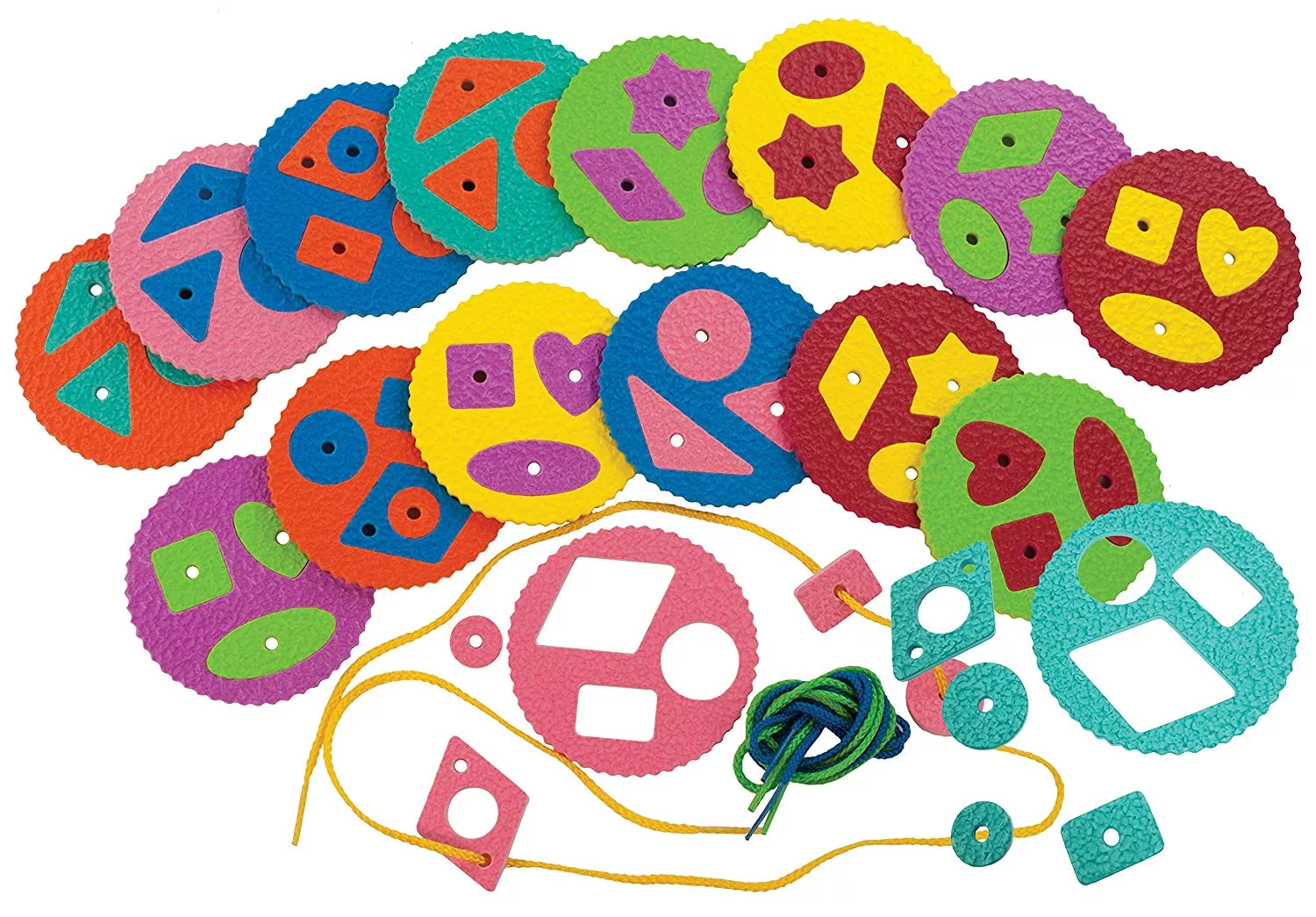 Развивайте мелкую моторику, навыки счета и сортировки с этими пластичными цветными формами. Шнурки длиной 69 см с кончиками. Разнообразие форм помогает детям развивать навыки пространственного мышления и воображения.