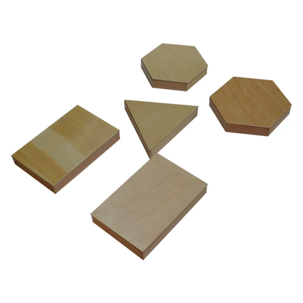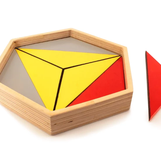 Малый шестиугольный ящик – с этим набором, ребенок узнает, что правильный шестиугольник можно построить из 2 трапеций, 6 равносторонних треугольников, 6 равнобедренных тупоугольных треугольников или из 3 ромбов.