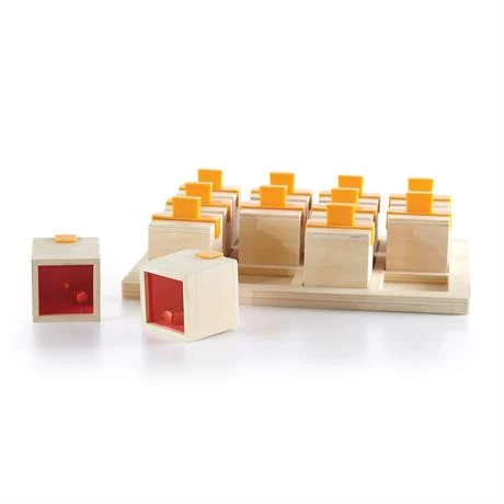 Игра для усиления когнитивного развития. Держа за мягкие пластиковые ручки, нужно встряхнуть деревянные кубики, и послушать звук каждого из них. Ребенку нужно угадать по звуку что внутри. Чтобы проверить ответ, нужно посмотреть в полупрозрачное цветное акриловое окно на дне каждой коробки.