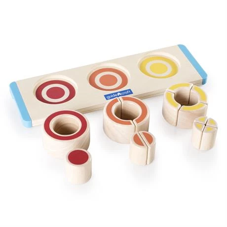 С этим набором можно комбинировать и сортировать сегменты деревянных кругов. Фигуры сделаны из каучукового дерева и прорезинены. Они делятся на четверти, половины и 8 частей. Прочная доска-подставка с пластиковыми ручками. Набор показывает практическое понимание математических концепций через сегменты круга.