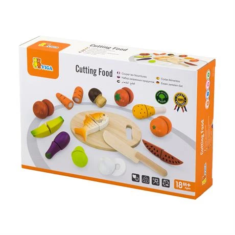 Яркий деревянный набор состоит из доски для нарезки, комплекта продуктов и ножа. Все продукты дети могут разделить на половинки, а потом соединить с помощью текстильной застежки.