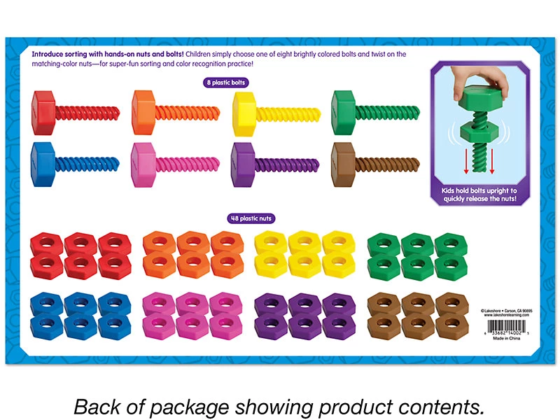 Обучаю сына цветам благодаря этим гайкам. Закручивать их ребенку пока сложновато, но это из-за возраста (2 года), для детей постарше будет идеально. В наборе 48 гаек и 8 основ. Все основы для гаек разноцветные, гайки идут в соответствии с основой. Качество супер!
