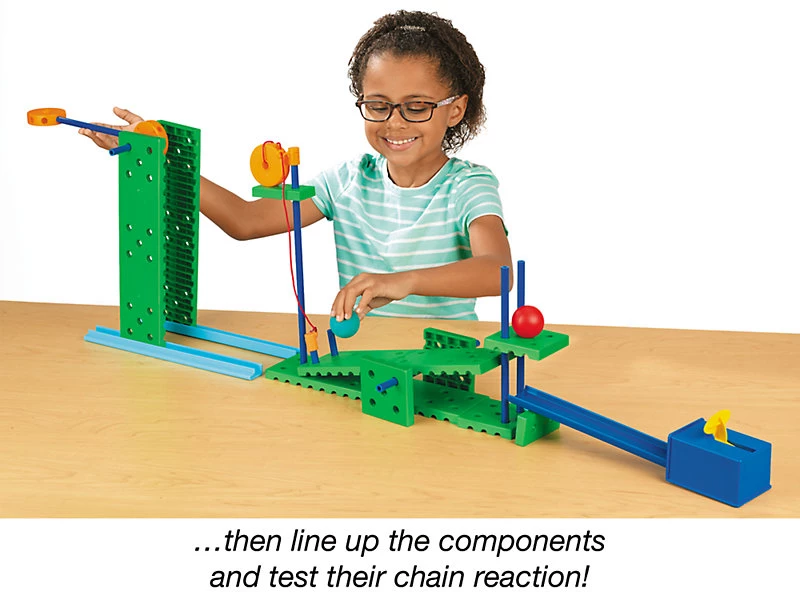 Набор позволит ученикам на практике понять значение цепной реакции и с интересом пронаблюдать за ней. Дети смогут сами построить трек, используя горки, маятники, подвесные элементы и другие детали набора, а затем проследить как шарик пройдя все преграды, достигнет финиша!