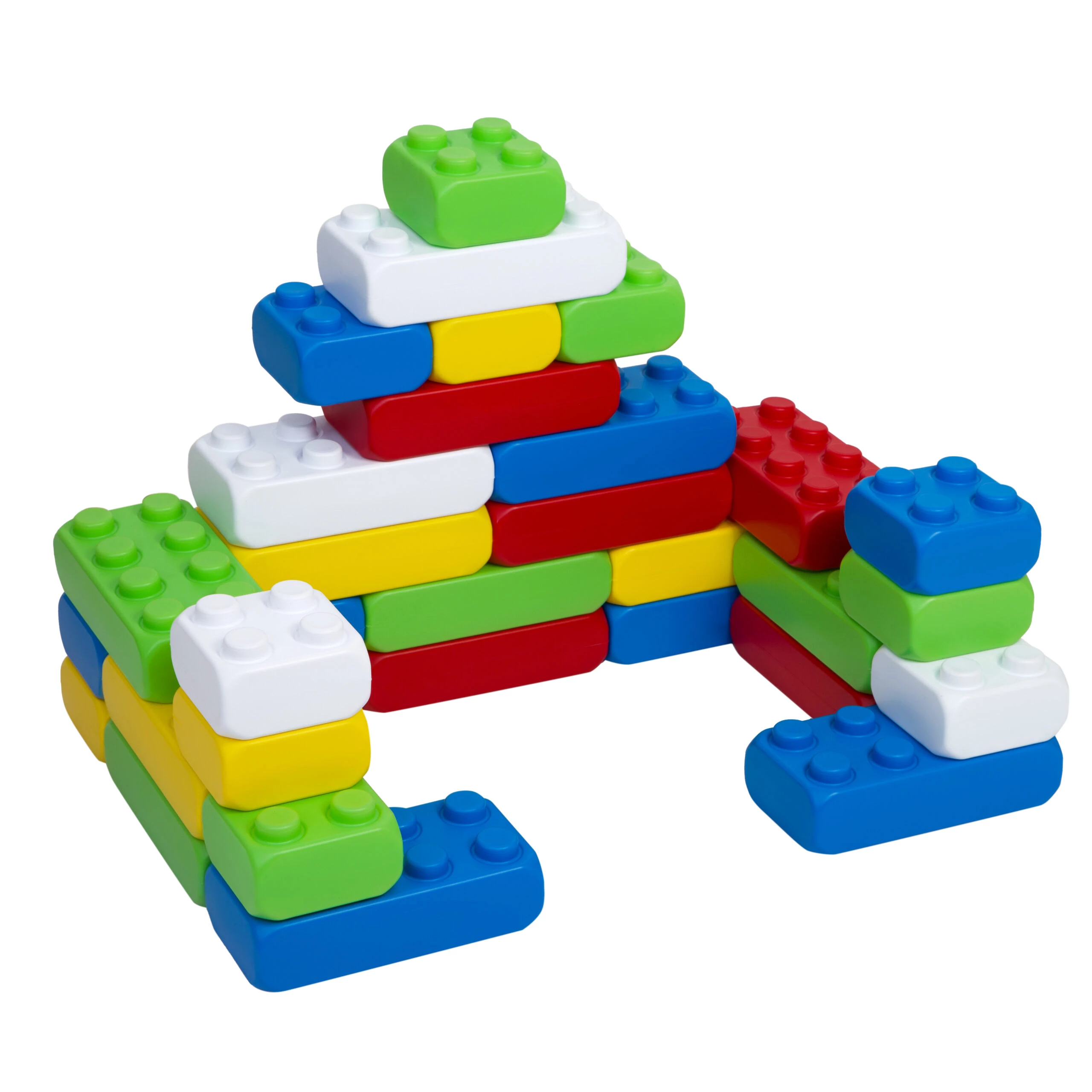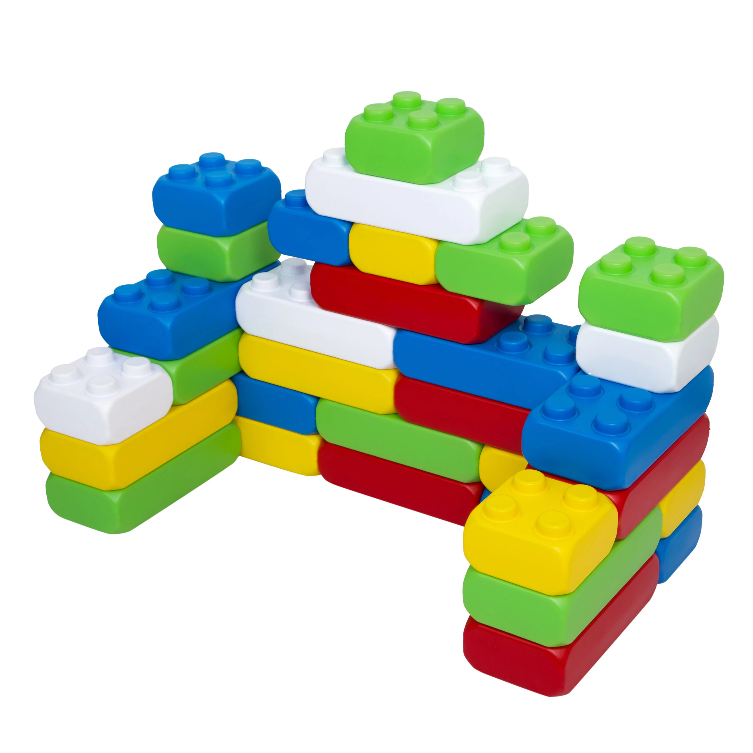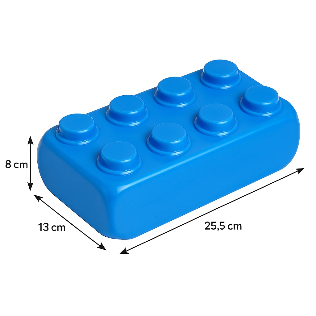 Предлагаемый набор включает в себя 20 блоков размером 13 x 25,5 x 8 см и 10 блоков размером 13 x 13 x 8 см. Детали выполнены из легкого и прочного пластика. Яркие оттенки блоков вдохновляют на открытия, а стройка отлично тренирует моторику.