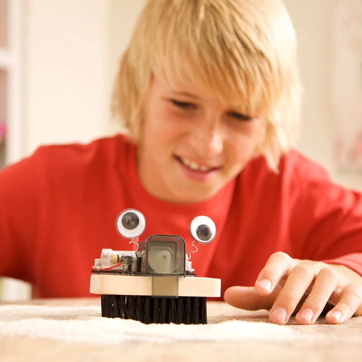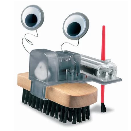 Для работы нужны 2 AAA батарейки (не входят в набор). Батарейки обеспечивают мотор энергией, которая заставить робота двигаться. Моторчик начинает вращать ротор. Так как центр тяжести ротора смещен относительно оси двигателя - возникает вибрация, которая передвигает робота из стороны в сторону и вверх-вниз. Робот щетка подпрыгивает, щетинки пригибаются и толкают робота в сторону своего наклона.