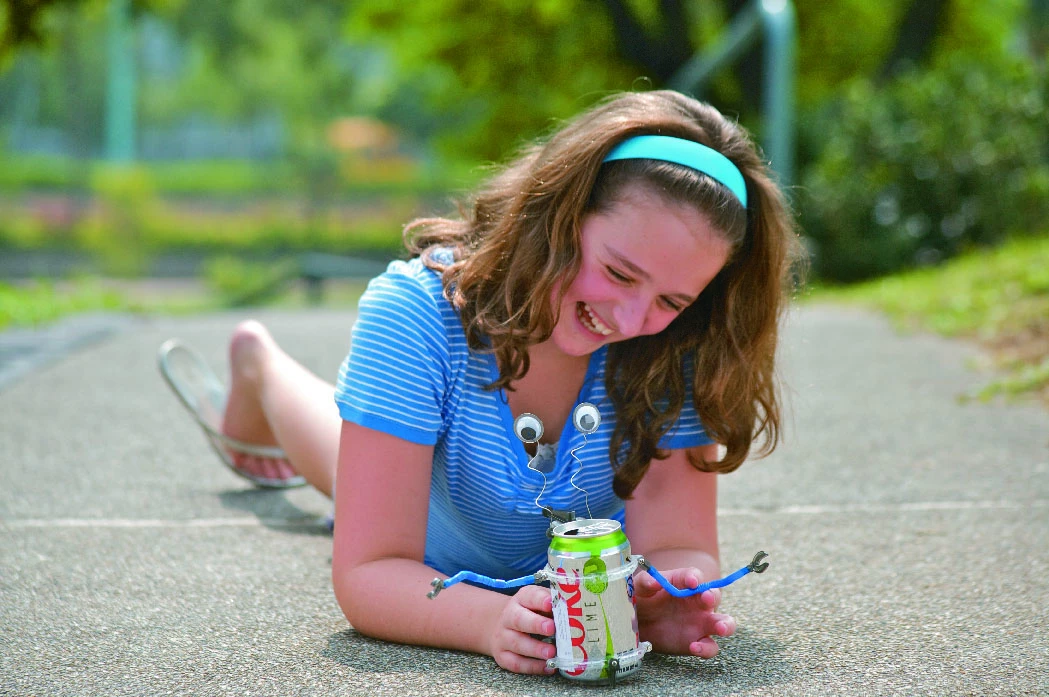 Каждый день выбрасываются миллионы металлических банок. А ведь можно банку превратить в веселого робота. Робот забавно движется и у него смешно болтаются глазки. Робот может ходить и ползать. Батарея питает электромотор, и шестеренка быстро вращаться. Она является редуктором и вращает зубчатое колесо с небольшой скоростью. При включении мотора, пластиковые опоры на концах оси вращаются и поднимают робота с обеих сторон.