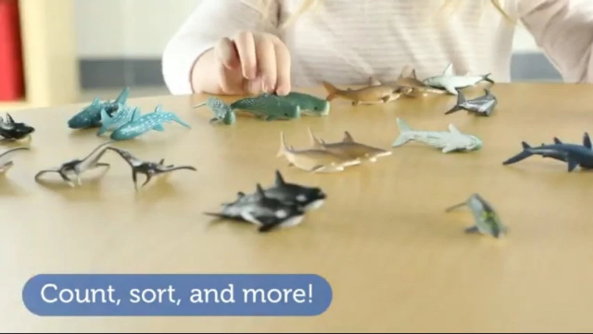 Исследуйте мир подводных морских животных! Акулы, киты и другие животные из океана помогут детям освоить сортировку, счет, сопоставление и другие навыки. В наборе из 50 фигурок, представлены 10 различных видов: киты, акулы и другие рыбки. Исследуйте глубины океана с китом, отправляйтесь на охоту с большой белой акулой или отправьтесь в путешествие с рыбой манты - в этом наборе есть все! После игры, все фигурки удобно хранятся в коробке с крышкой.