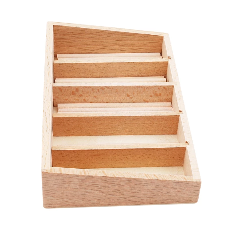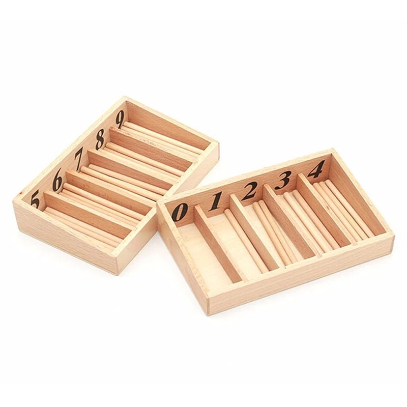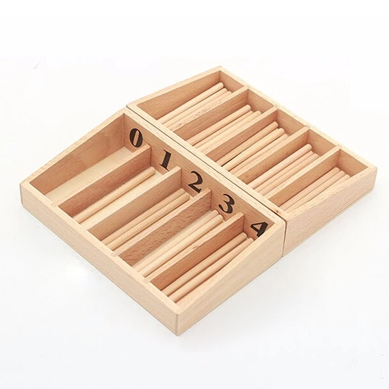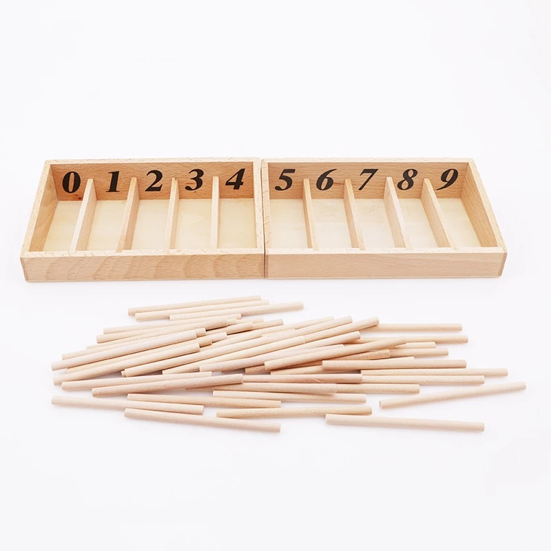 В наборе 2 ящика. На первом ящике стоят цифры 0-4, на втором ящике - цифры 5-9. Можно сдвинуть два ящика друг с другом и установить взаимосвязь чисел от 0 до 9. В каждом отделении ящика лежит столько веретен, сколько указано на его задней стенке. Веретена Монтессори позволят выучить множество чисел от 0 до 9, разбитое на единицы. Выучить последовательность цифр 1-9. Узнать понятие 0.