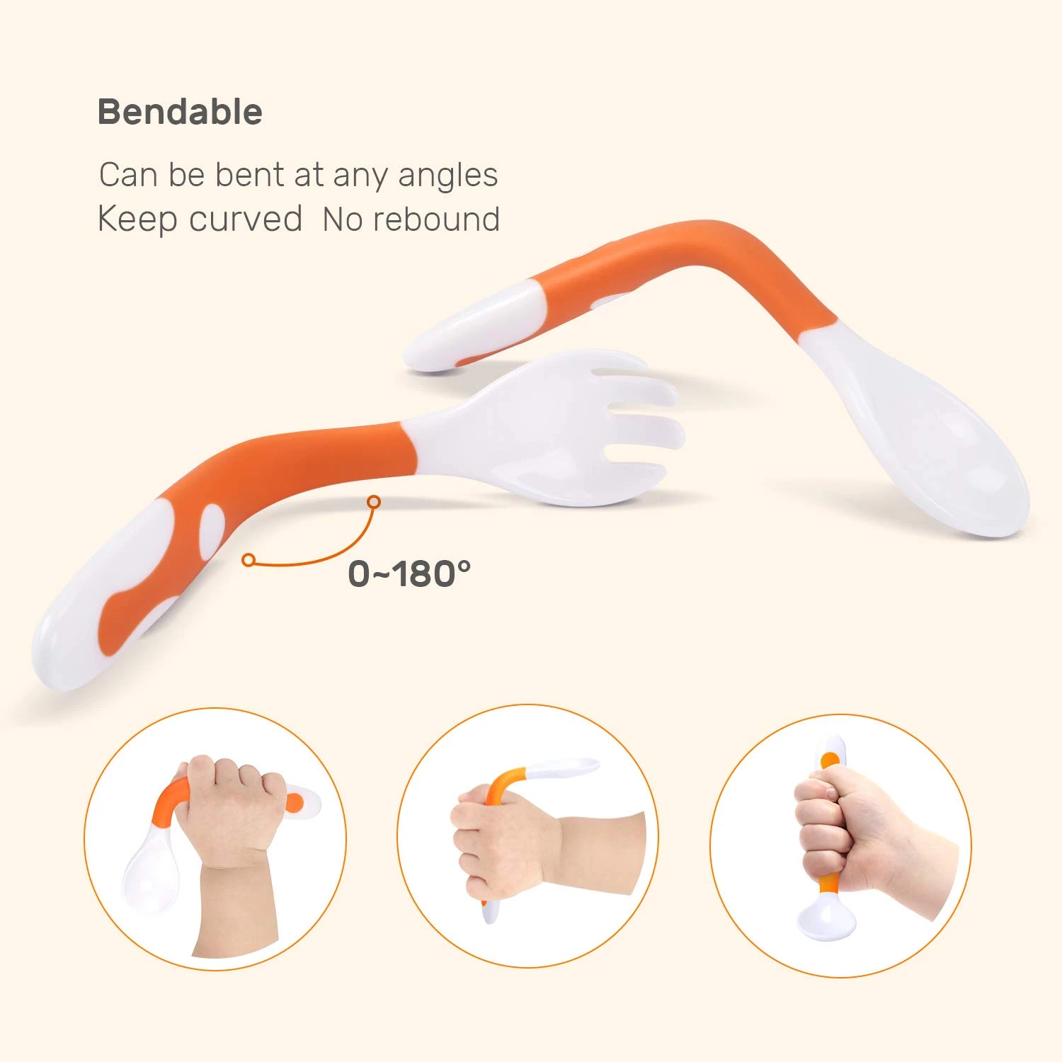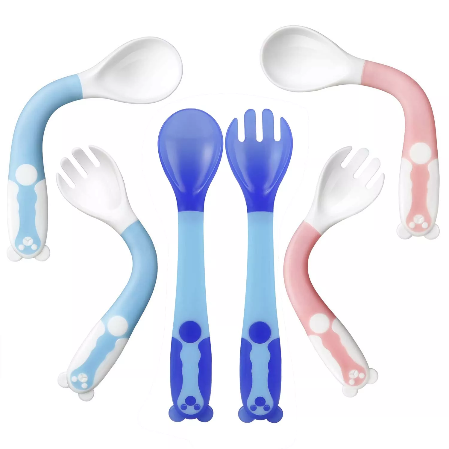 Чтобы ребенок научился правильно пользоваться столовыми приборами, лучше использовать такие тренировочные варианты. Ложки и вилки выполнены из качественного безопасного материала, абсолютно безвредного. В комплекте прилагаются модели с изгибом, для универсального применения. Приборы имеют приятную нескользящую поверхность, позволяющую использовать их с максимальным комфортом. Они абсолютно безопасны, поскольку не имеют острых краев, а только закругленные зубцы. Вилки можно сгибать влево или вправо или наклонять вперед на 90 градусов.