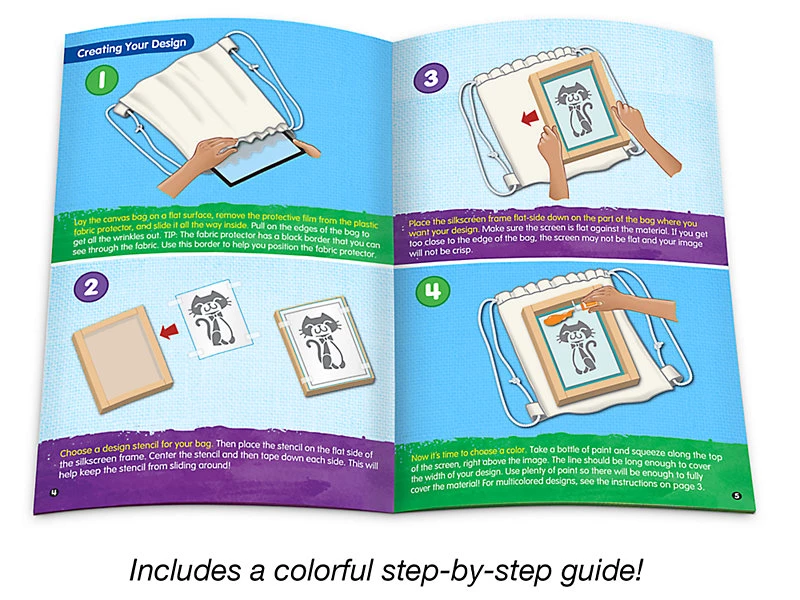 Креативный набор для создания уникальных принтов на ткани. В наборе дети найдут все что позволит легко добавлять яркие образы в одежду и аксессуары! Иллюстрированная книжка с пошаговыми инструкциями поможет создавать принты, а удобный холщовый мешок отлично подойдет для первой пробы пера! в нем потом удобно хранить набор или носить с собой.