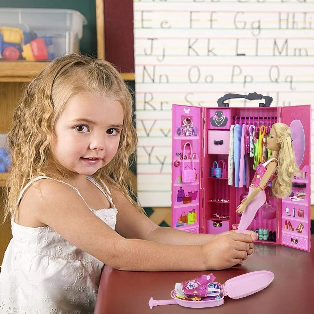 Замечательный набор для маленькой любительницы Барби. Компактная гардеробная содержит множество нарядов, украшений, обуви и аксессуаров. Ребенок сможет подбирать разнообразные образы, комбинировать вещи и развивать свое воображение. Кукла в наборе не идет, но вся одежда подходит для стандартной куклы Барби, ростом 30 см. Шкаф компактно складывается, сверху имеется ручка, чтобы можно было брать с собой в путешествие или в гости. Это прекрасный подарок на любой праздник, от дня рождения до Нового года.
