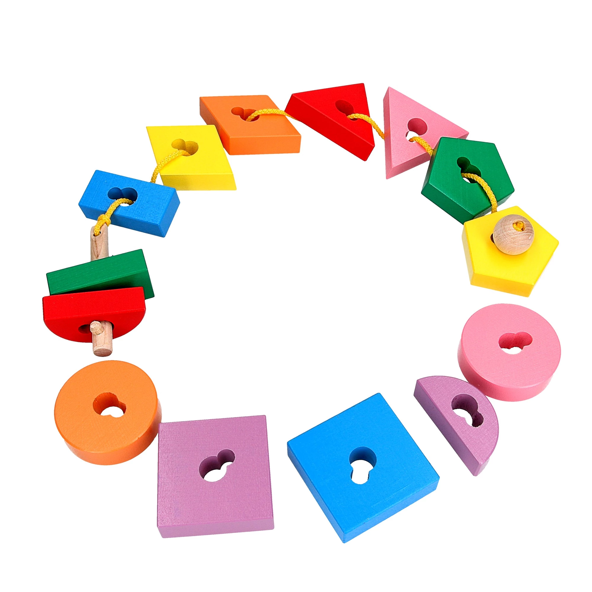 Представляем вашему вниманию увлекательную игрушку-шнуровку, которая обязательно понравится вашему малышу. Данная игрушка — не только развлечение, но и замечательный тренажер для маленьких ручек и пальчиков. Она состоит из приятных на ощупь деревянных геометрических фигур разных цветов, которые можно нанизывать на шнурок в определенном порядке, или сортировать, постигая основы классификации.