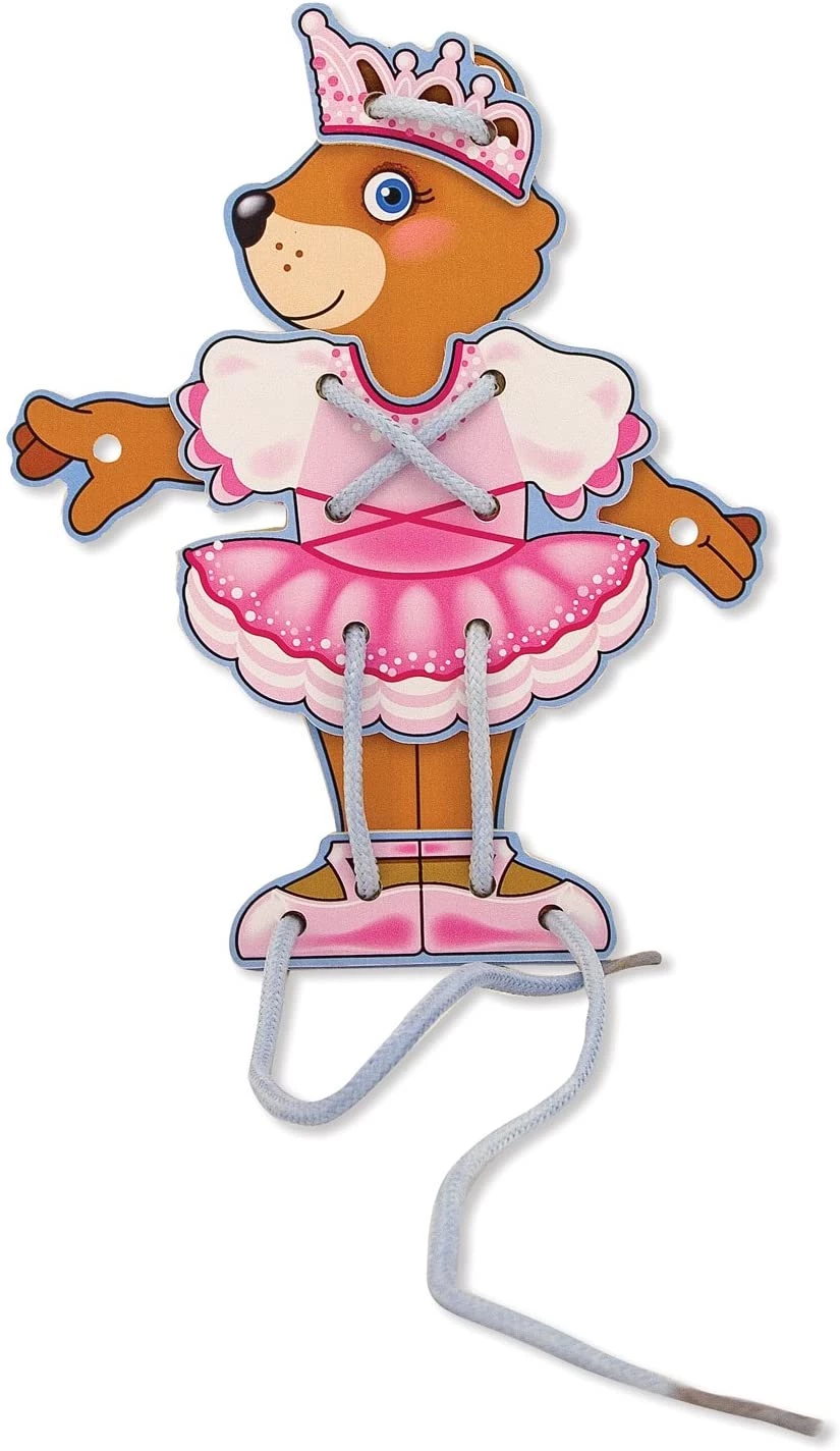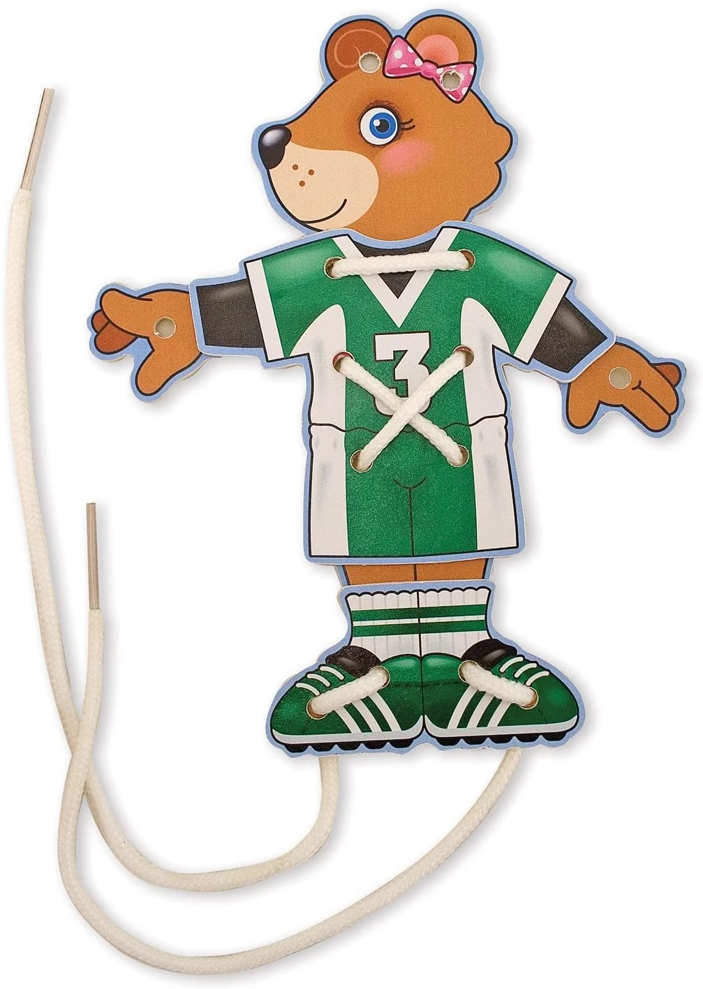 Эта деревянная игрушка-одевалка поможет ребенку развить сенсомоторику и навыки шнурования. Есть одна фигурка мишки, которую необходимо наряжать в различные наряды, используя при этом разнообразные виды шнуровки. Можно комбинировать совершенно разные варианты одежды. Получившейся фигуркой можно играть и придумывать всевозможные приключения для нее. Помимо этого, на шнурках можно потренироваться завязывать бантики и узелки.