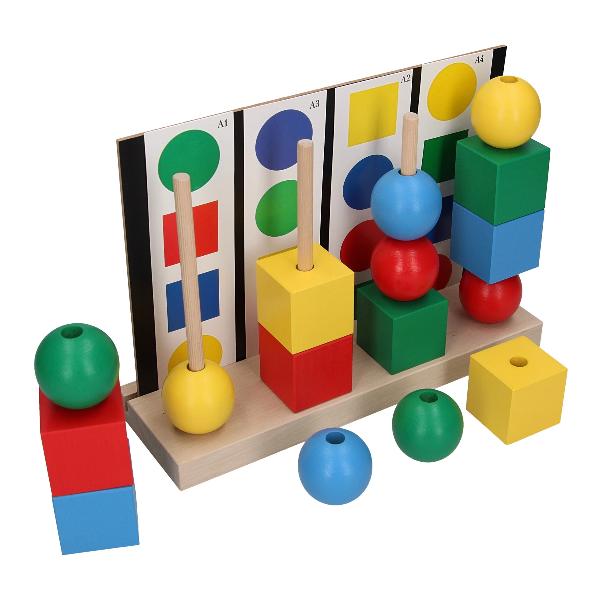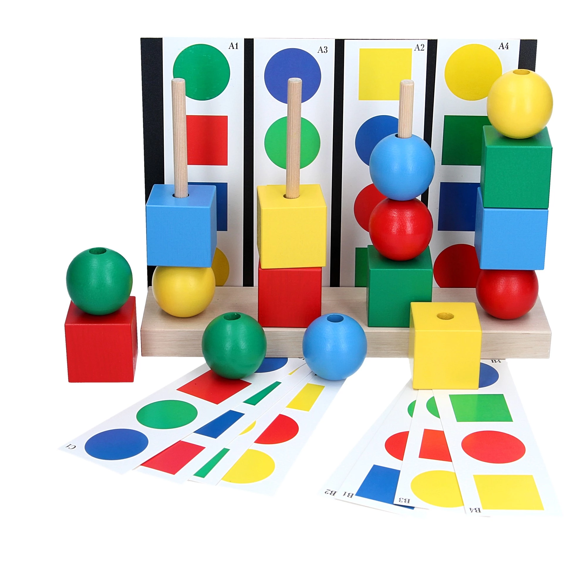 В комплект включены 12 карточек с заданиями и фигуры разного размера (кубик 4 x 4 x 4 см, шарик 4 см).