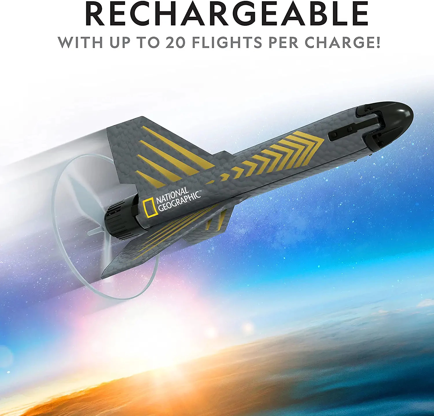 При помощи набора от National Geographic можно сконструировать необычную модель ракеты. Приспособление с мощным электродвигателем сможет взлетать на высоту до 60 метров! Электродвигатель ракеты питается от перезаряжаемой литий-ионной батареи, что обеспечивает до 20 запусков на одном заряде. Ракета легко заряжается посредством прилагаемого кабеля. На полную зарядку требуется всего 30 минут. Такая игрушка станет фаворитом ребенка для развлечений на свежем воздухе.