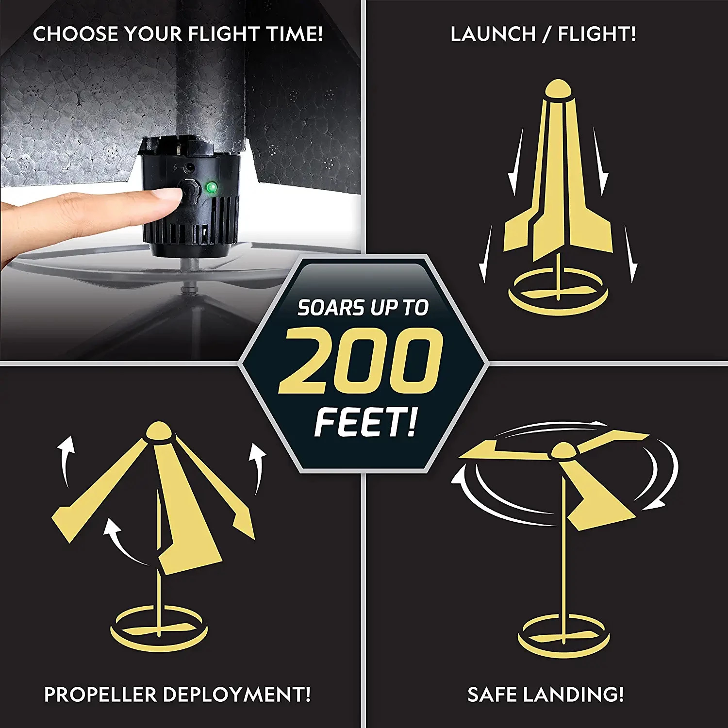 Запуск ракеты — довольно простой процесс. После полной зарядки просто поместите ракету на прилагаемую пусковую установку, затем нажмите на кнопку запуска один, два или три раза, чтобы установить продолжительность полета. Затем сделайте шаг назад и приготовьтесь к запуску. Как только ракета поднимается на максимальную высоту, лопасти несущего винта освобождаются, и устройство плавно и безопасно возвращается на землю.