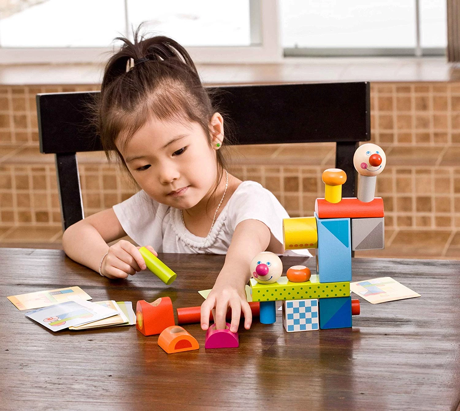 В комплект входит 18 ярких деревянных форм, 20 игровых карт и игровые инструкции.