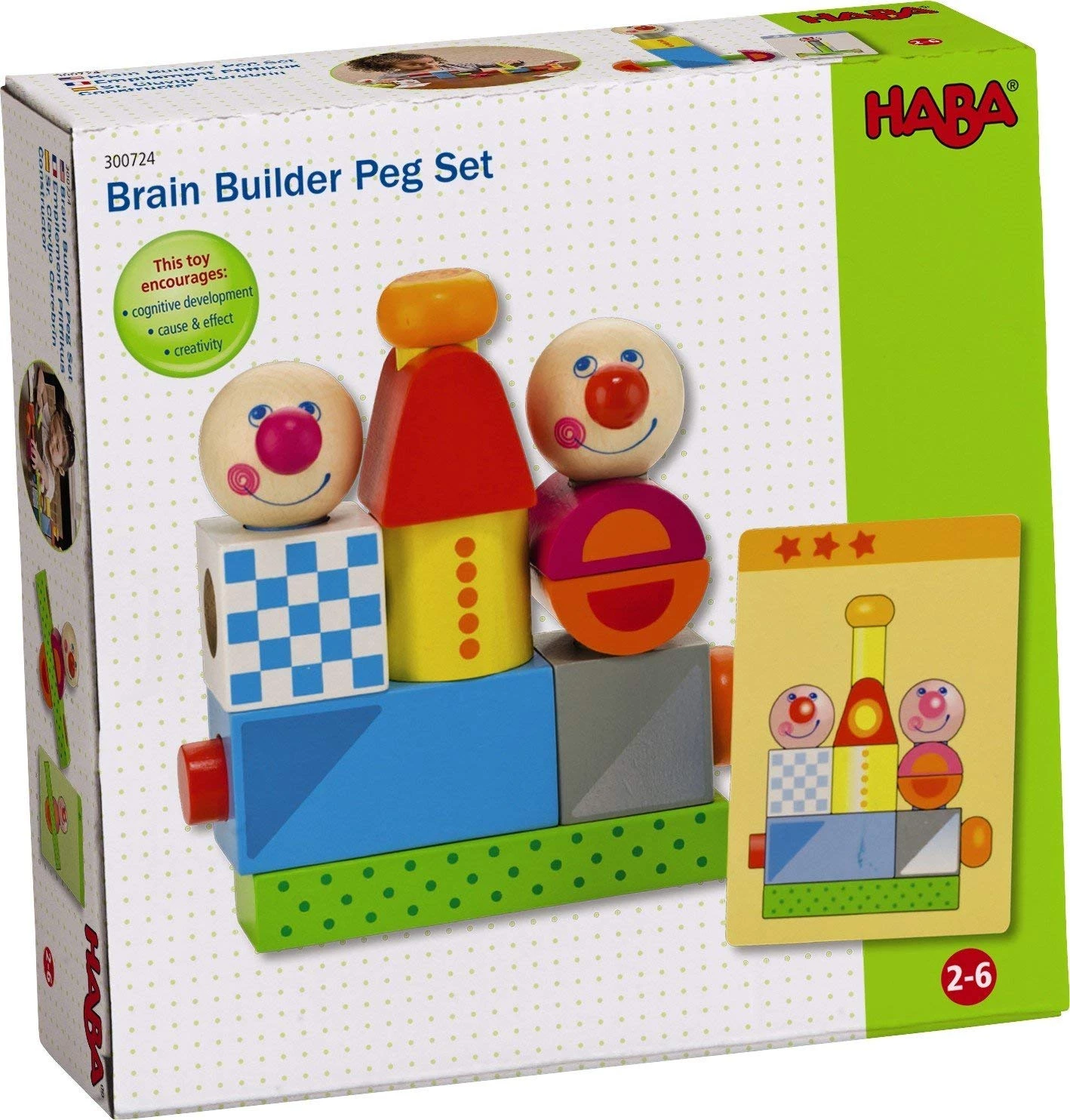 В наборе 18 ярких цветных форм из цельного дерева, в которых есть квадраты с отверстиями, цилиндры с головами и большими носами, шары, штифты и многое другое для выполнения строительных задач.