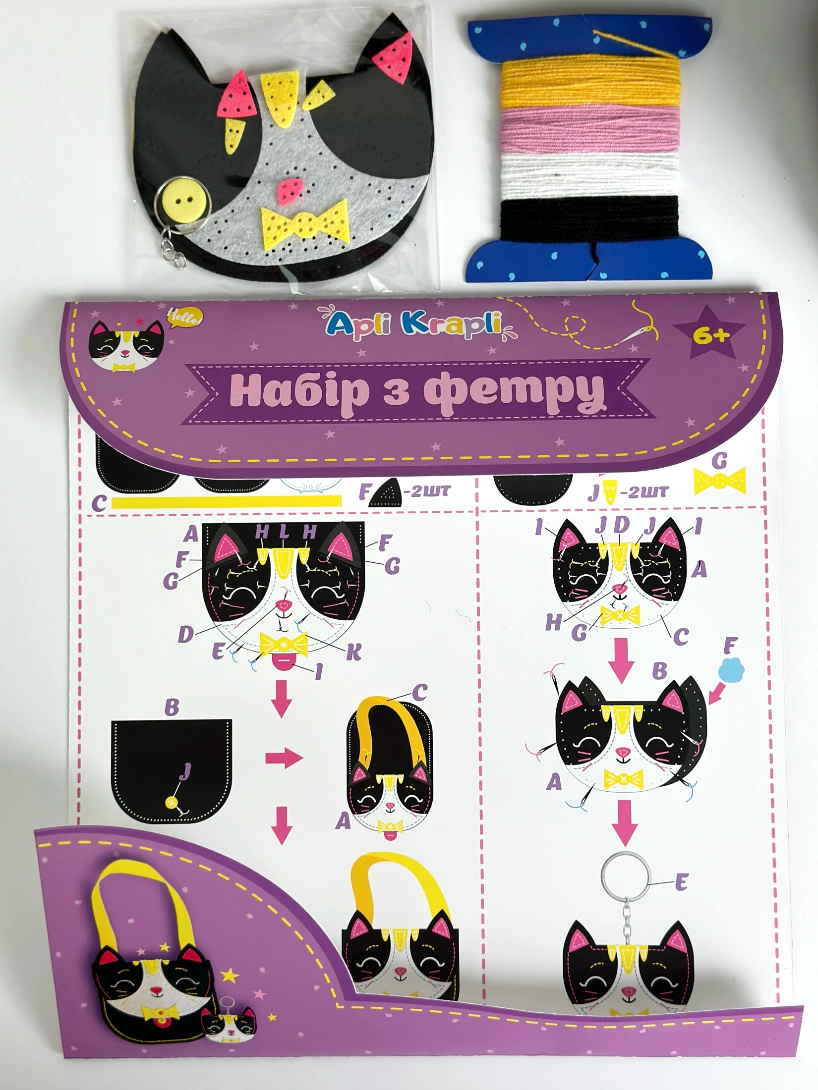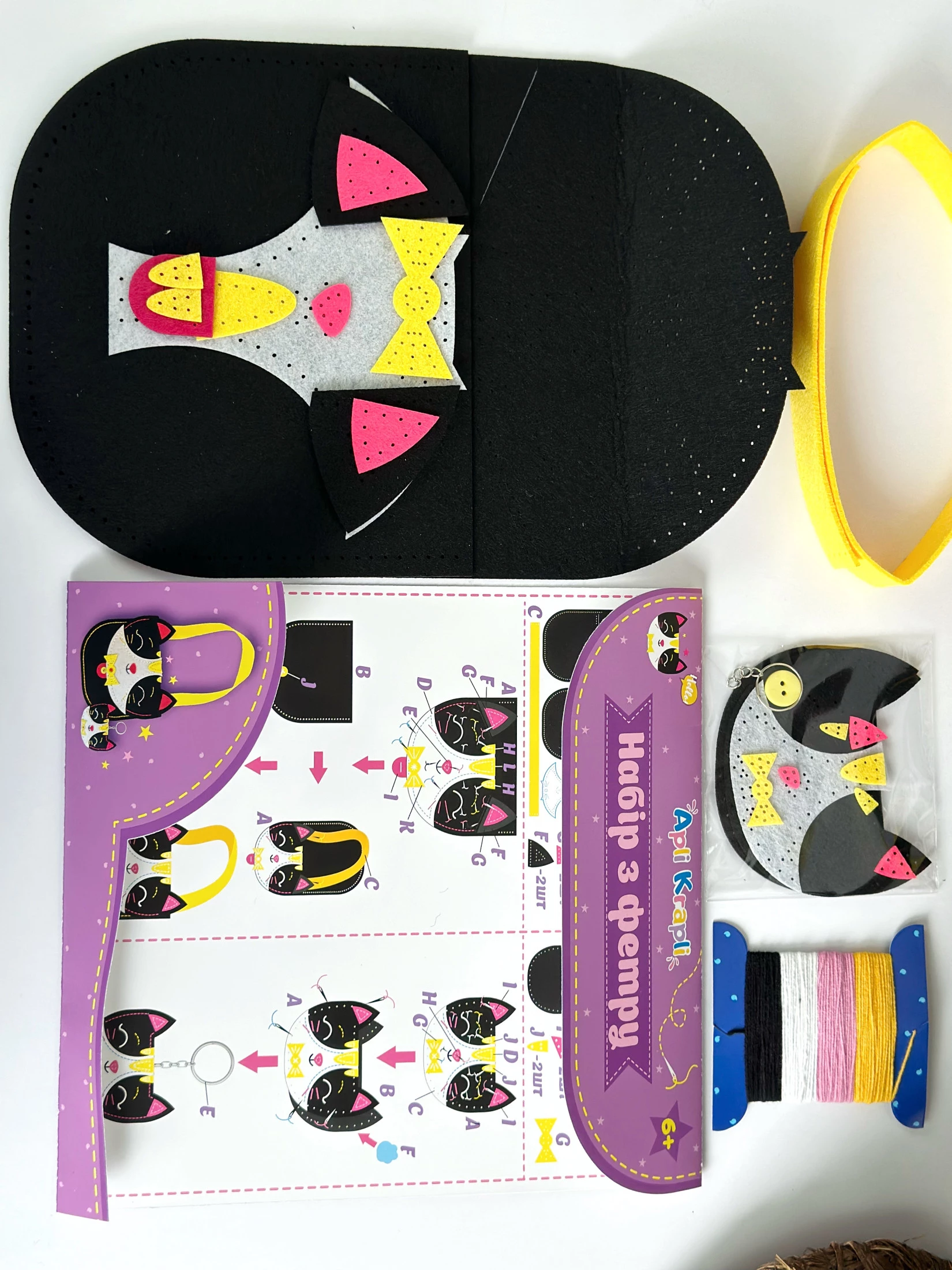 Набор включает в себя предварительно перфорированные фетровые детали, разноцветные нитки, безопасную иглу, а также инструкцию.