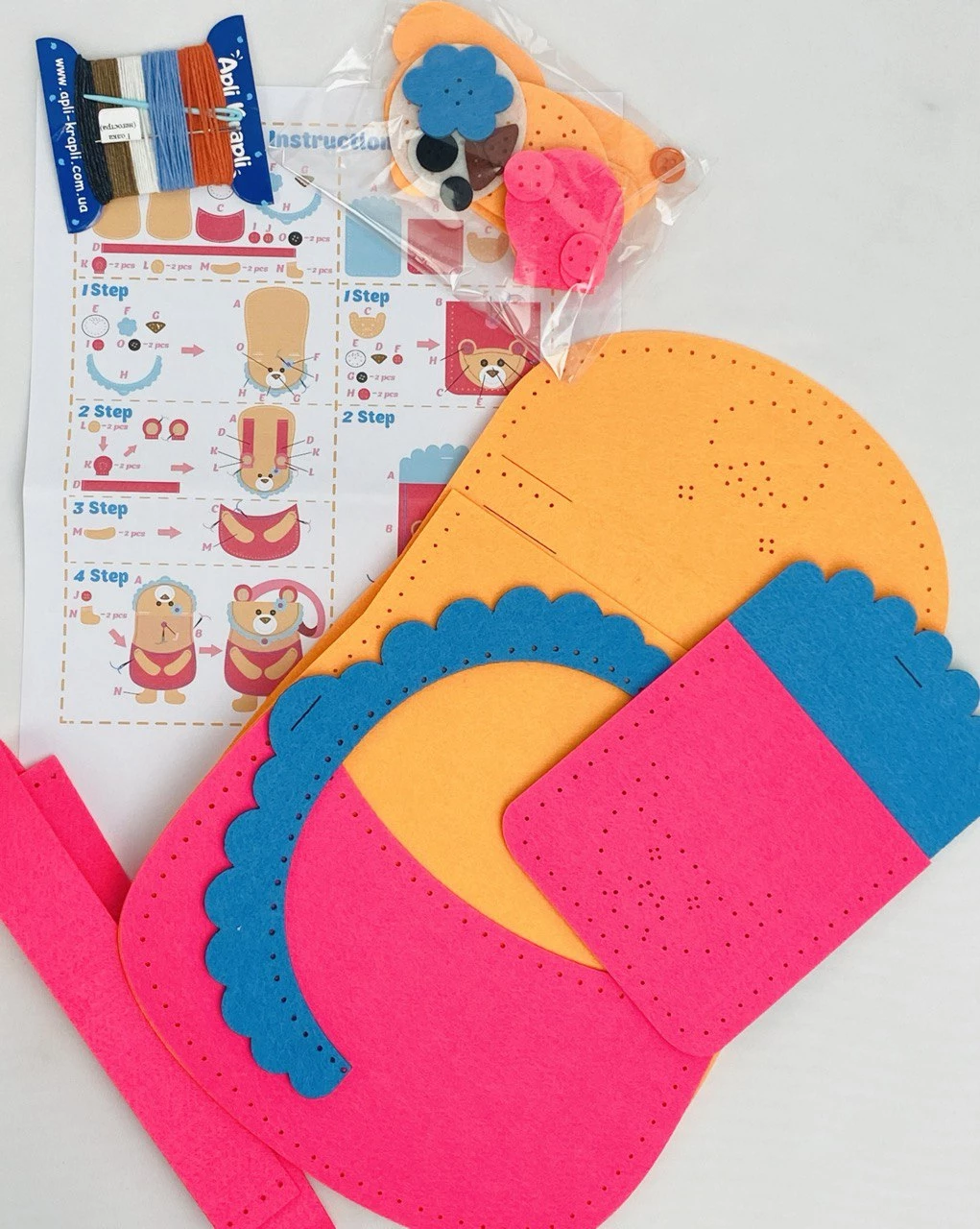 Комплект включает в себя детали из фетра с перфорацией, пластиковую иголку и разноцветные нитки.