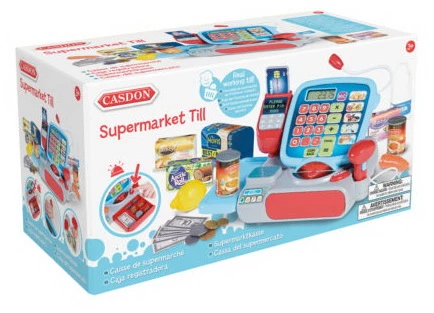 В набор входит игрушечная еда, касса с открывающимся отсеком для хранения денег, монеты и бумажные купюры, карта.