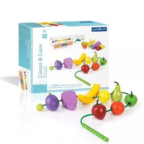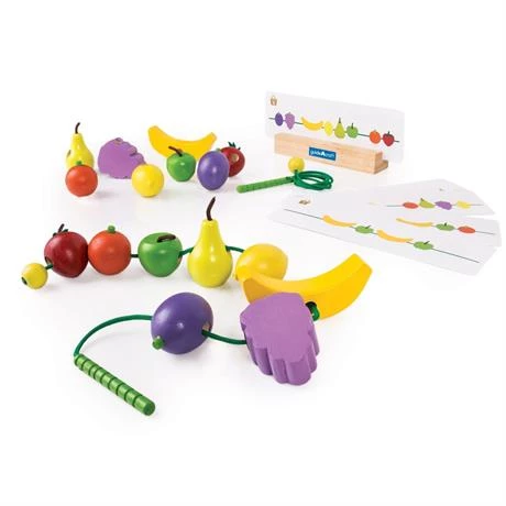 Яркая разноцветная шнуровка учит детей нанизывать 8 различных видов фруктов. Шнурки с деревянными колышками в форме гусеницы и стопорами из бусин. Карточки с примерами помогут учителям и детям во время творческих уроков.
