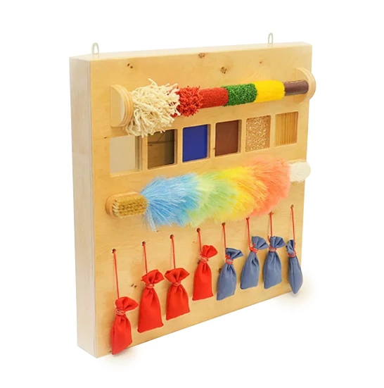 На доске размещены разные материалы, развивающие тактильные ощущения (структура материала, теплопроводность и пр.). Все материалы экологически чистые и безопасные.