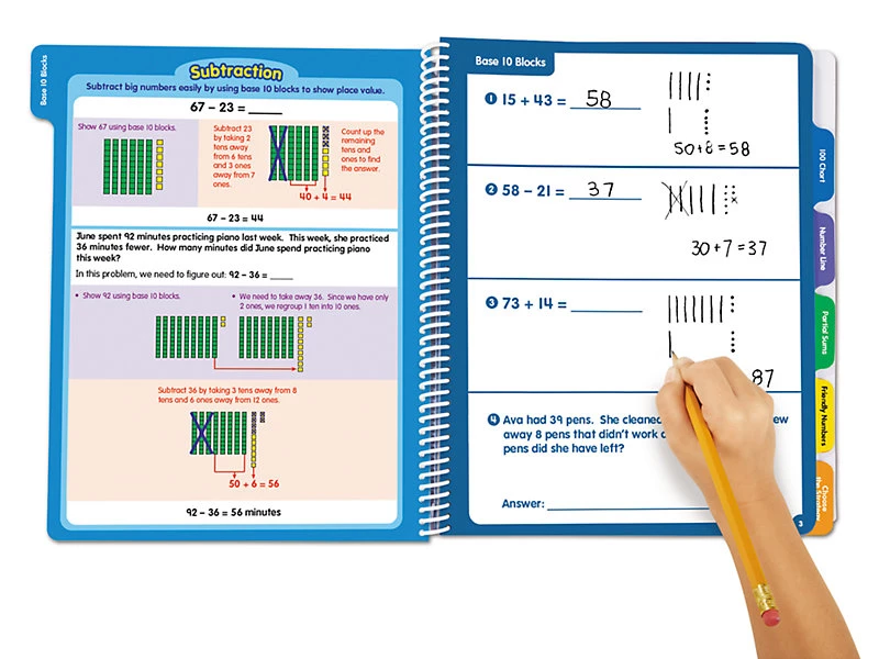 Дети смогут практиковаться в математике, решая примеры и выполняя задания в тетради. В этой тетради пять ключевых математических блоков: десятки, числовые линии, сложение, сотни и другие. Кроме того, есть даже раздел, где можно попрактиковаться в применении всех изученных ранее математических навыков для решения различных математических задач.