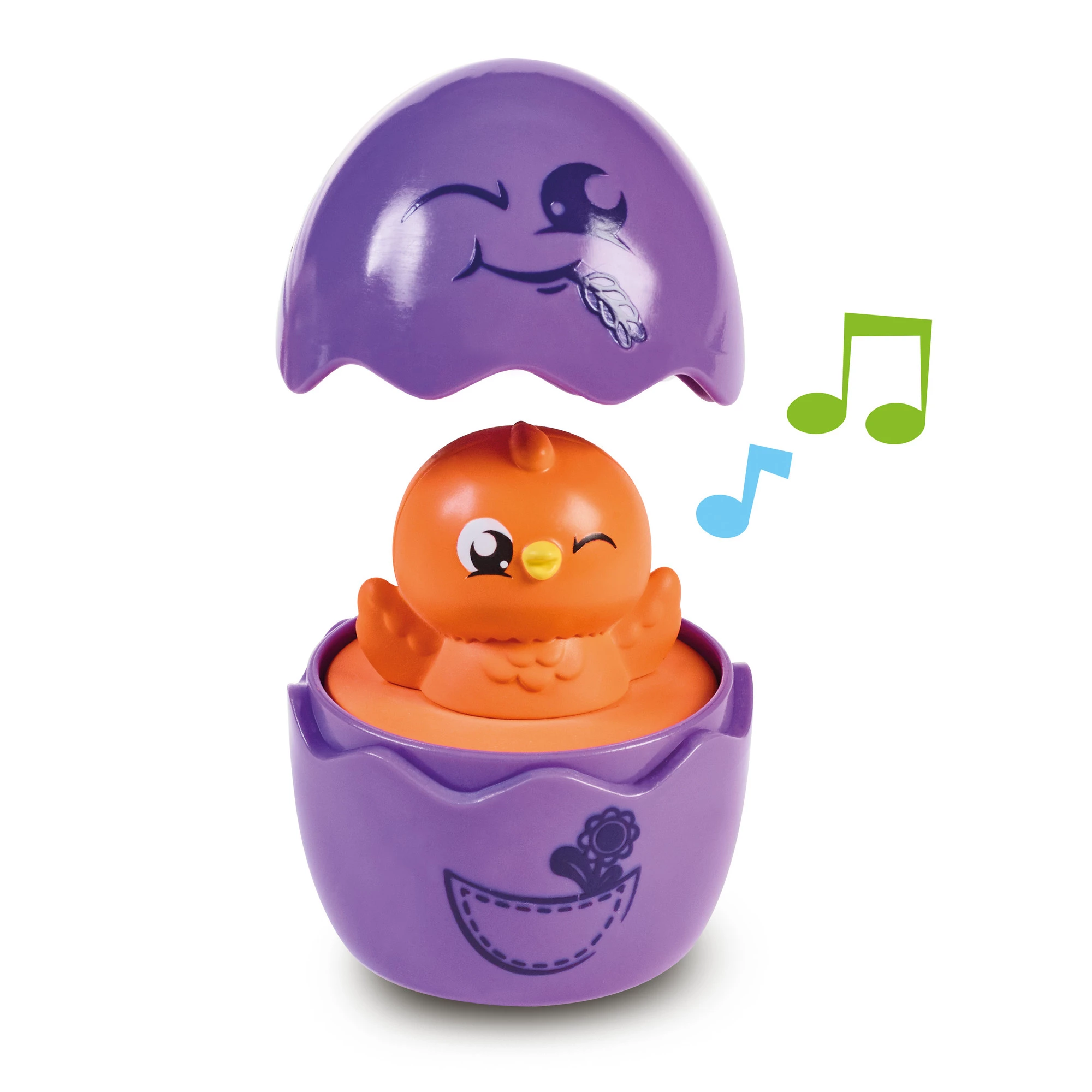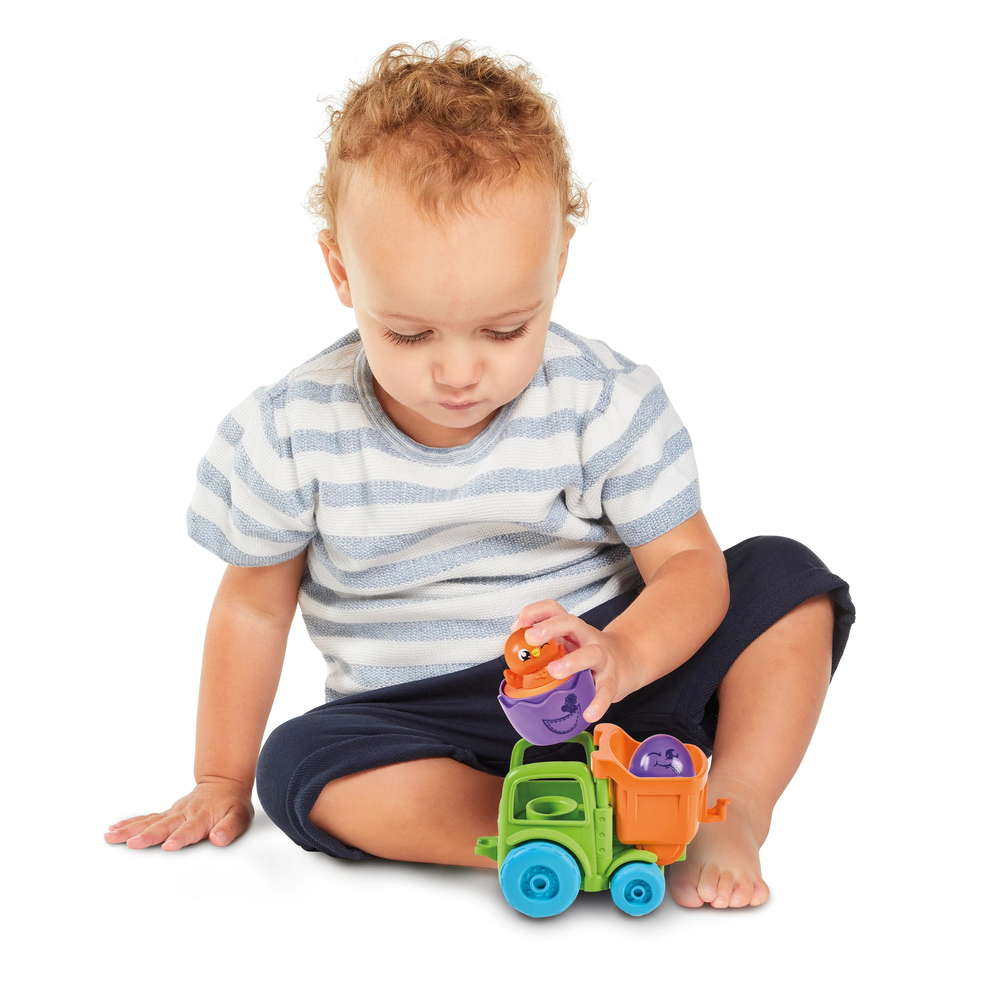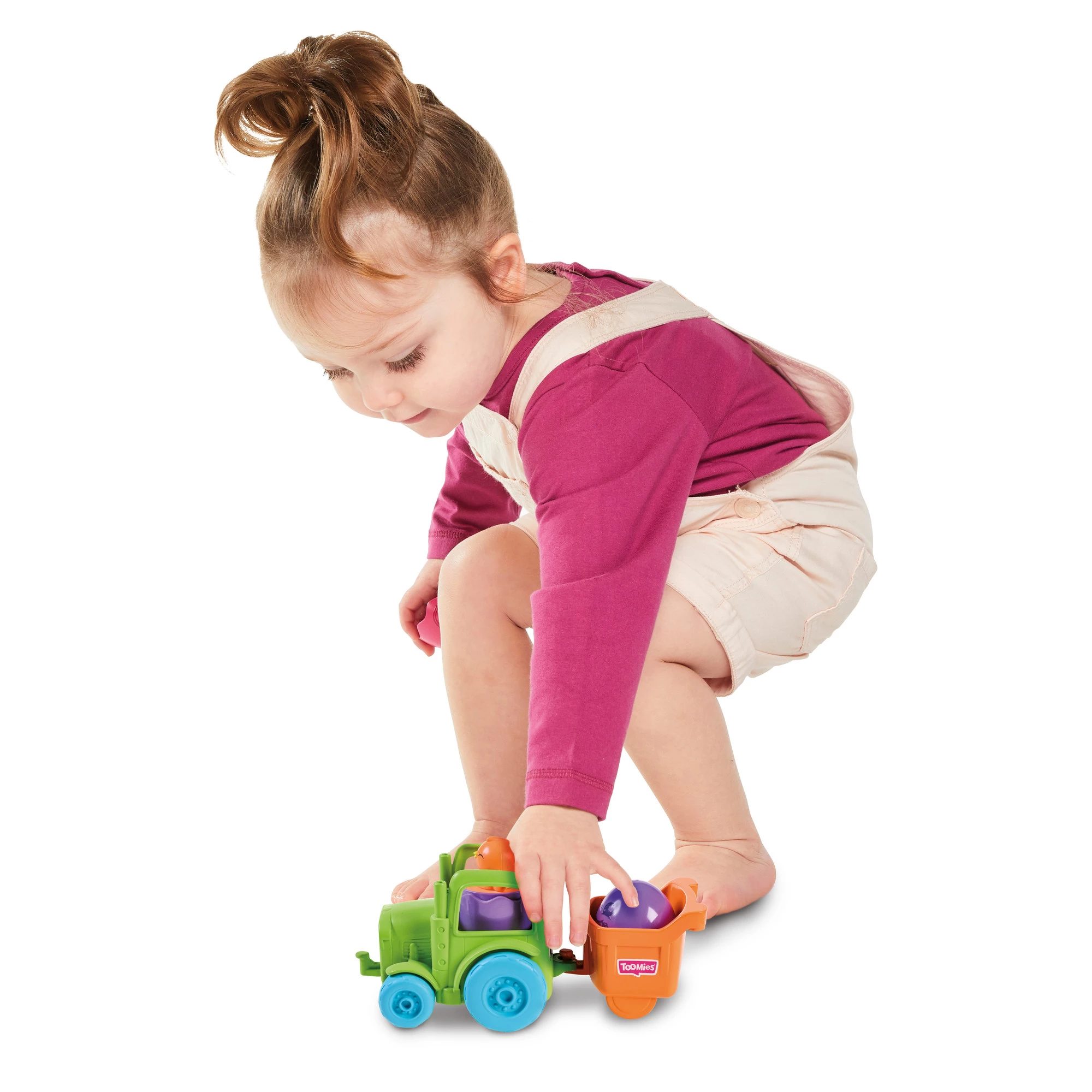 Трактор от Toomies сочетает в себе функционал двух транспортных средств. Во-первых, его можно использовать в качестве трактора с прицепом, а во-вторых — в роли самосвала. Трансформация игрушечного транспортного средства из трактора в самосвал осуществляется за считанные секунды. Достаточно перевернуть игрушку и вставить прицеп в специальные крепления. Все готово! Управляет трактором забавный птенчик, сидящий в яичной скорлупе. При нажатии на него можно услышать писк.