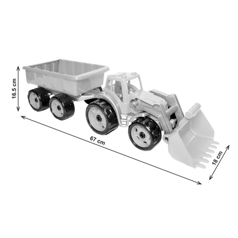 Изюминка игрушки — вместительный прицеп, который подымается вверх и позволяет удобно высыпать все содержимое. В прицеп можно загружать песок, камушки, кубики, детали конструктора и другие предметы.