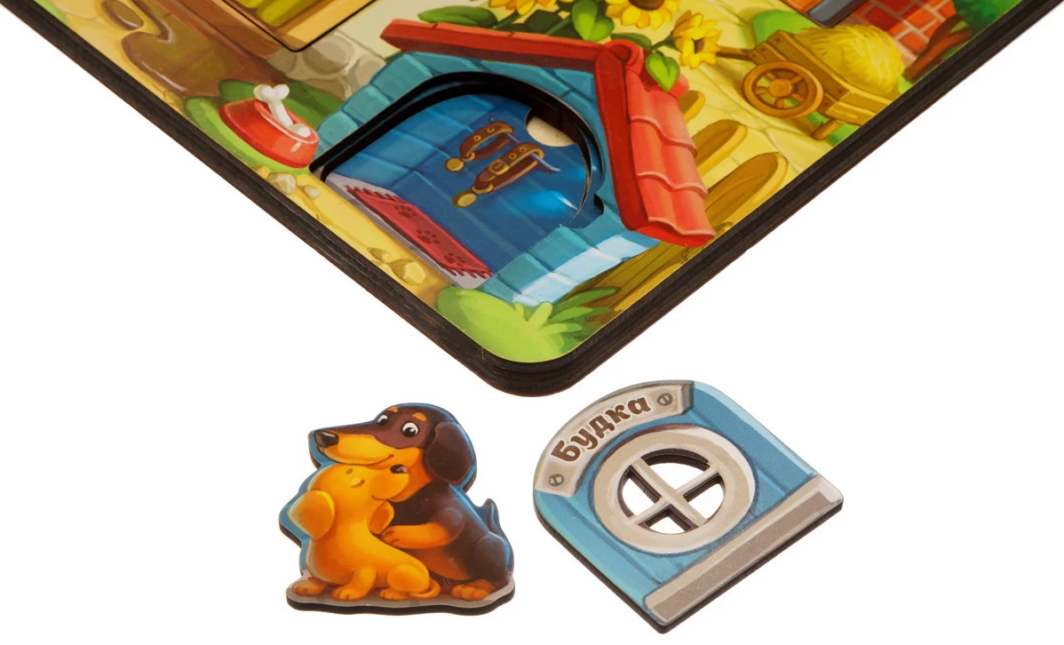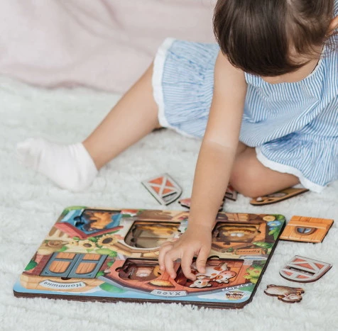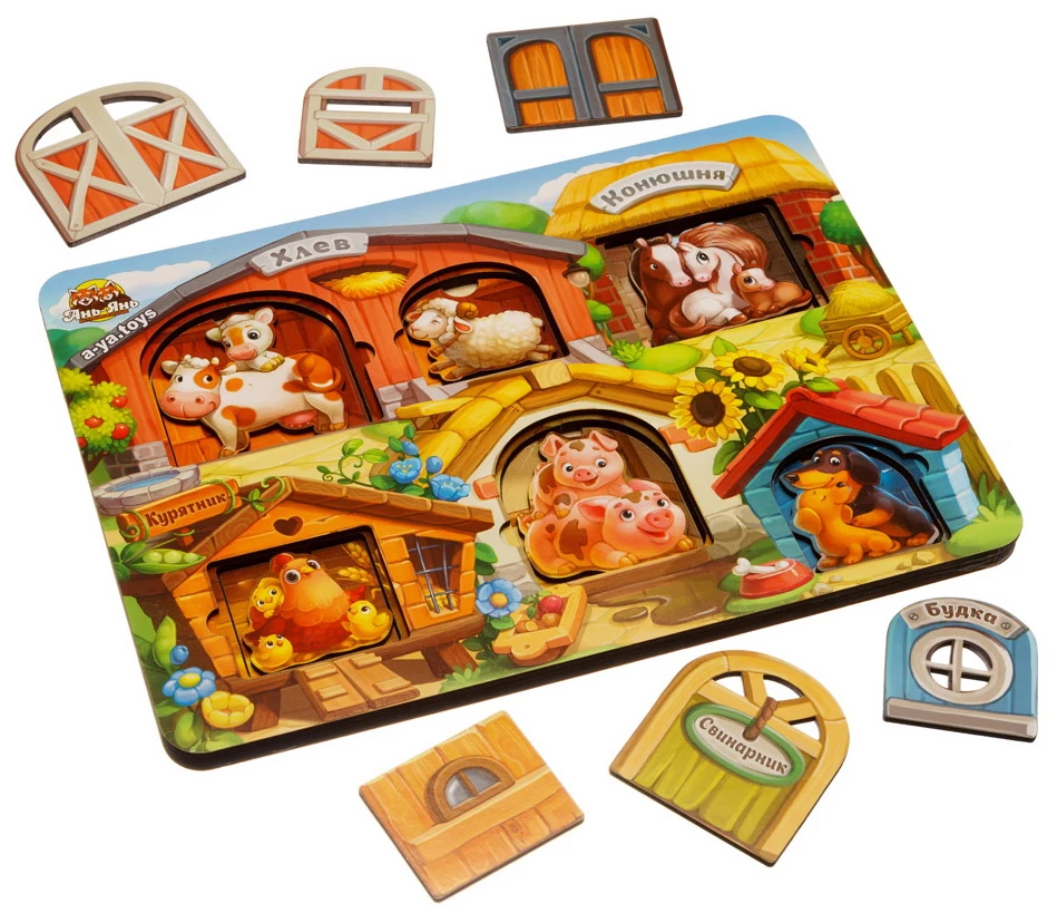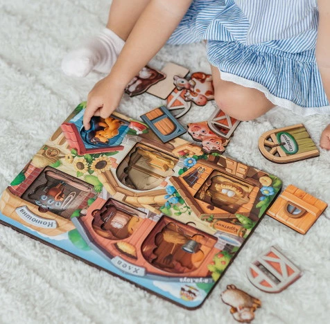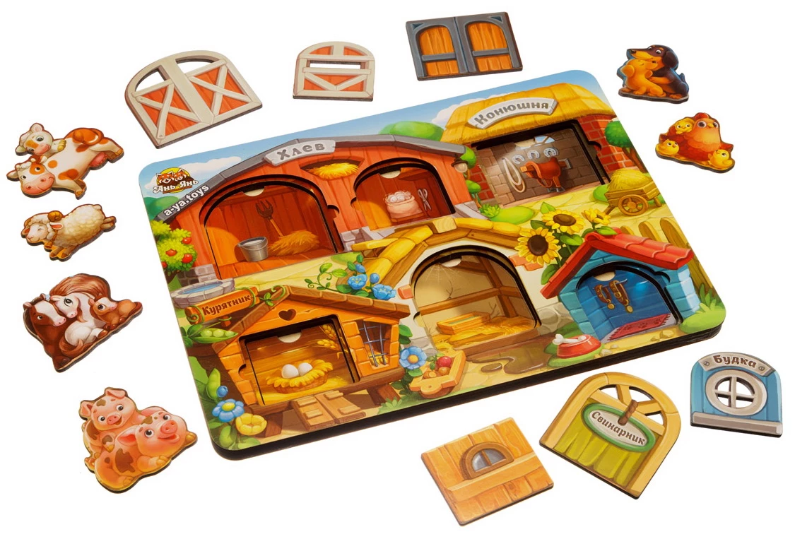 Отличный вкладыш из трех уровней с ячейками, в которые необходимо помещать животных. На большой ферме есть много жителей, каждому из них необходимо найти свой домик. Например, лошадок нужно поместить в конюшню, а свинок в свинарник. Такая игра отлично развивает кругозор, воображение и мелкую моторику. Животные изображены не в одиночку, всего 6 семей животных (мама и малыш), потому ребенок может потренировать свои арифметические способности, считая их.