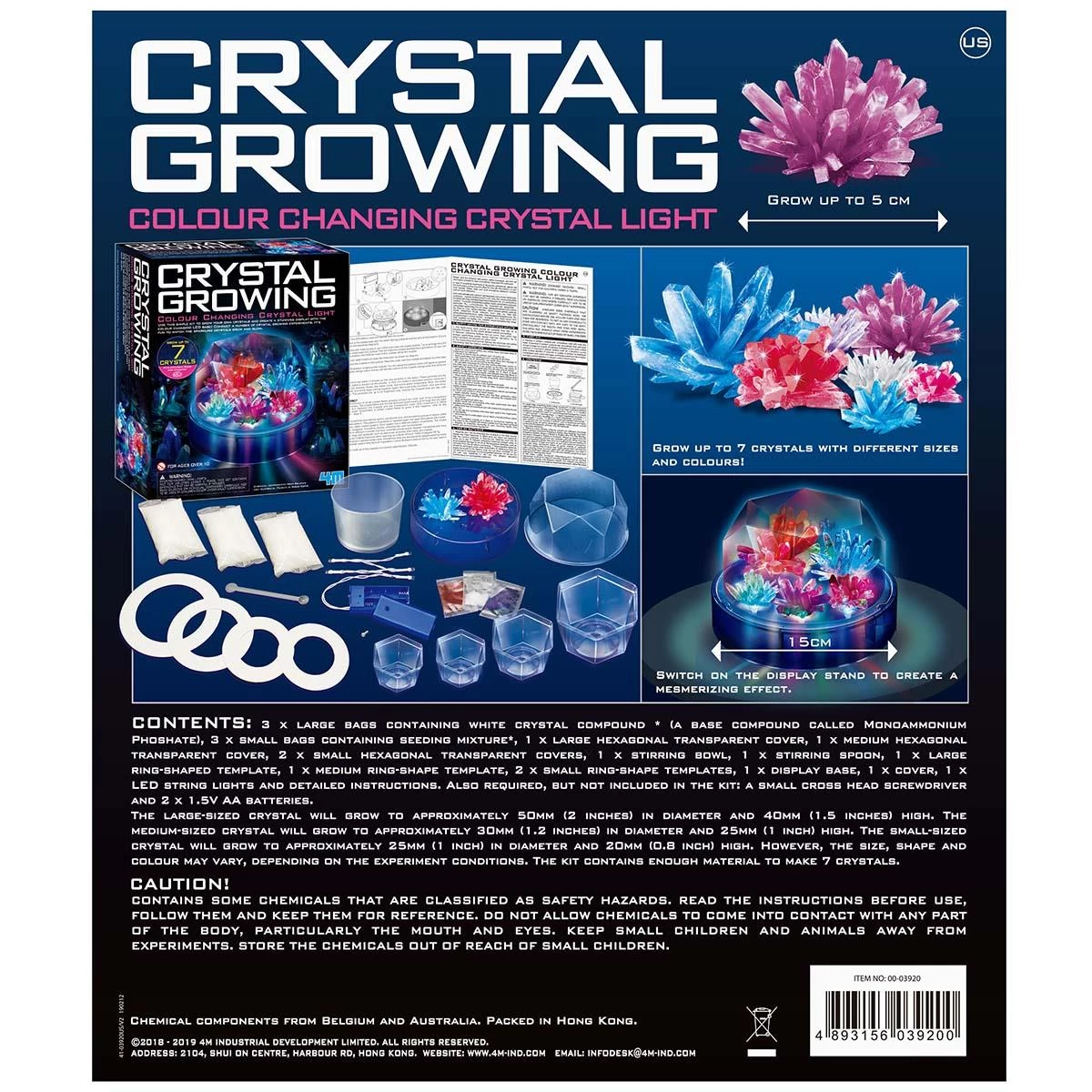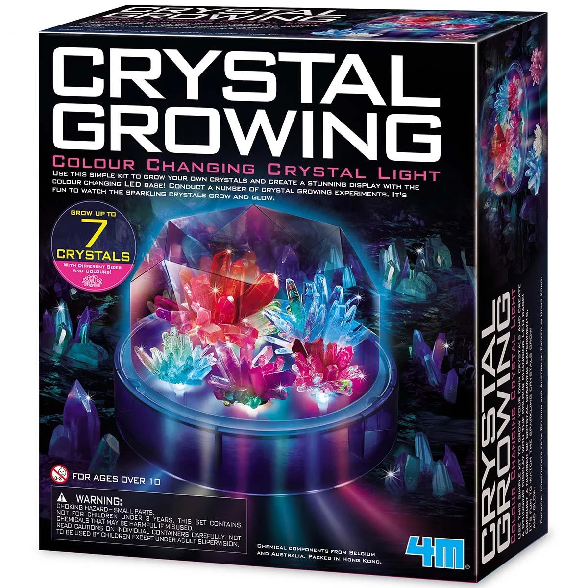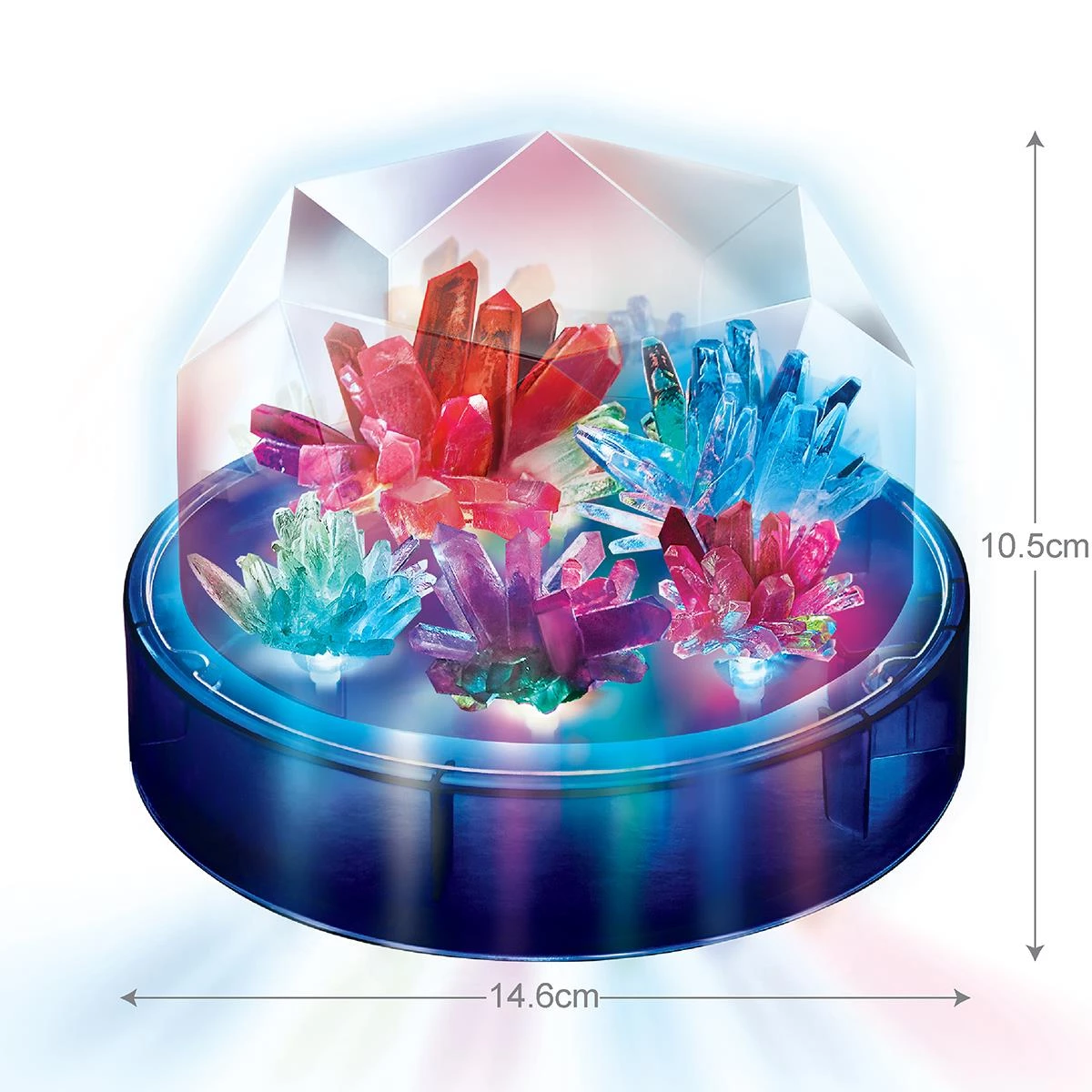 Интересный научный набор, с которым можно вырастить красивые кристаллы разных размеров. Их можно установить на подставку с цветной LED подсветкой. Проведя ряд химических экспериментов, дети с интересом смогут наблюдать как искрящиеся кристаллы растут и светятся.