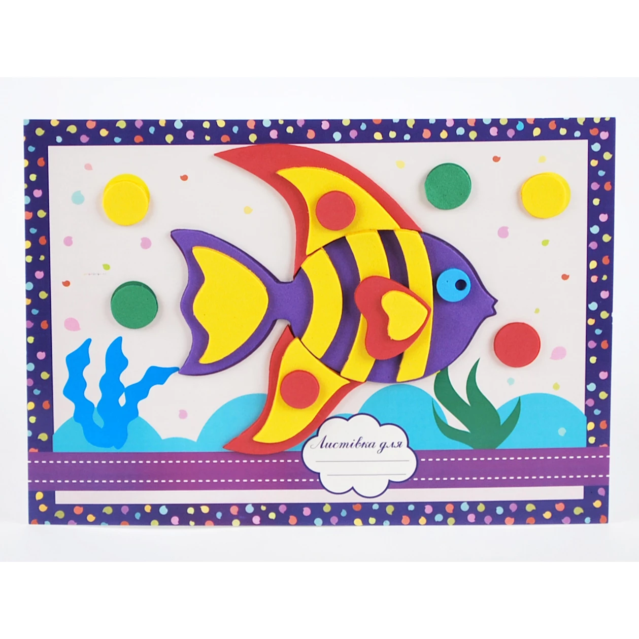 Цікава ідея, легке виконання і якісні матеріали - все це про даний набір для створення листівки-аплікації «Рибка». Разом з цим різнобарвним другом ваш малюк відправиться в захоплюючу подорож у світ творчості! Комплект включає в себе м'які деталі на клейовій основі, а також картонну основу з необхідним контуром - так створювати виріб набагато простіше! Створювати аплікацію буде цікаво, а готовий виріб пізніше можна буде підписати і подарувати кому-небудь! Подібні ігри є відмінним тренажером дрібної моторики, акуратності та посидючості!