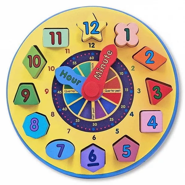 Різнокольорові дерев'яні годинники з 12 кольоровими дерев'яними блоками різної форми навчать дітей розбиратися в часі. Дітям подобаються хвилинні і годинникові стрілки з кольоровим кодуванням, які обертаються простим натисканням. Діти можуть підбирати кольори, сортувати фігури і вирішувати головоломки, маніпулюючи кольоровими блоками, розвиваючи когнітивні і моторні навички.