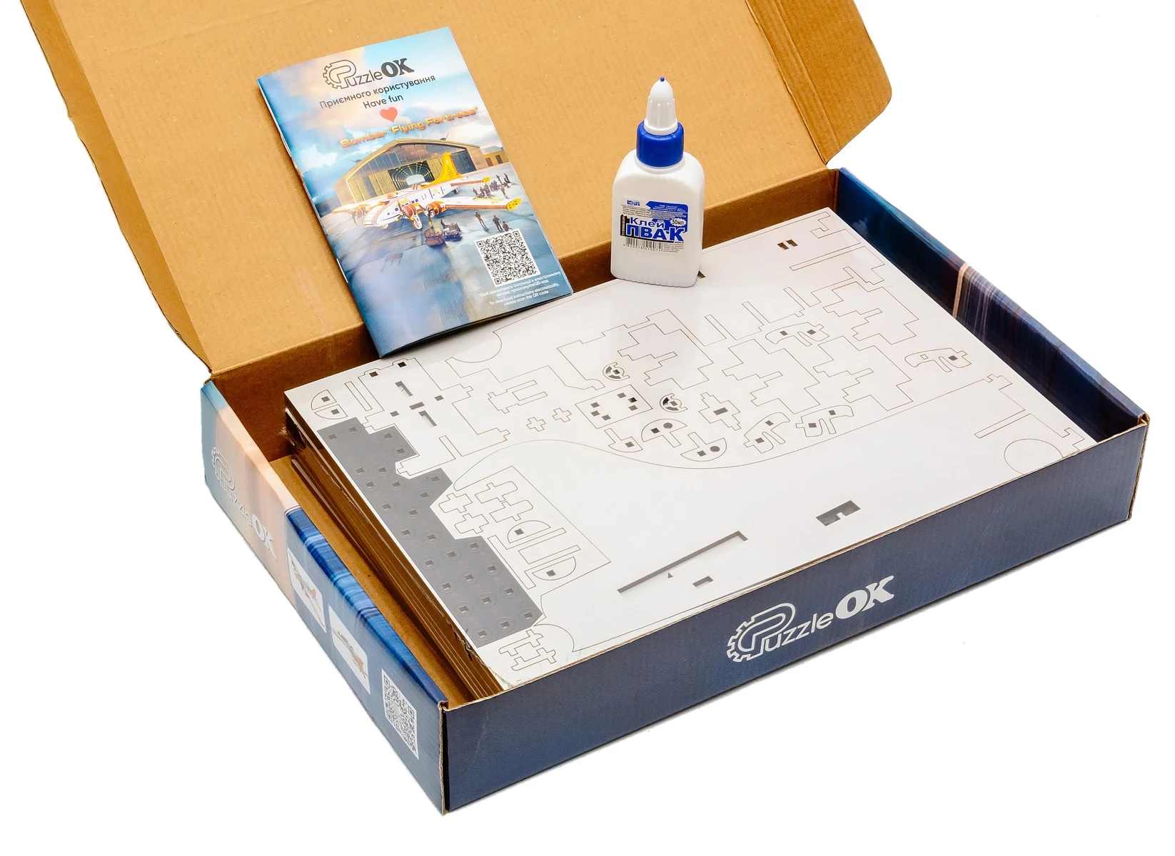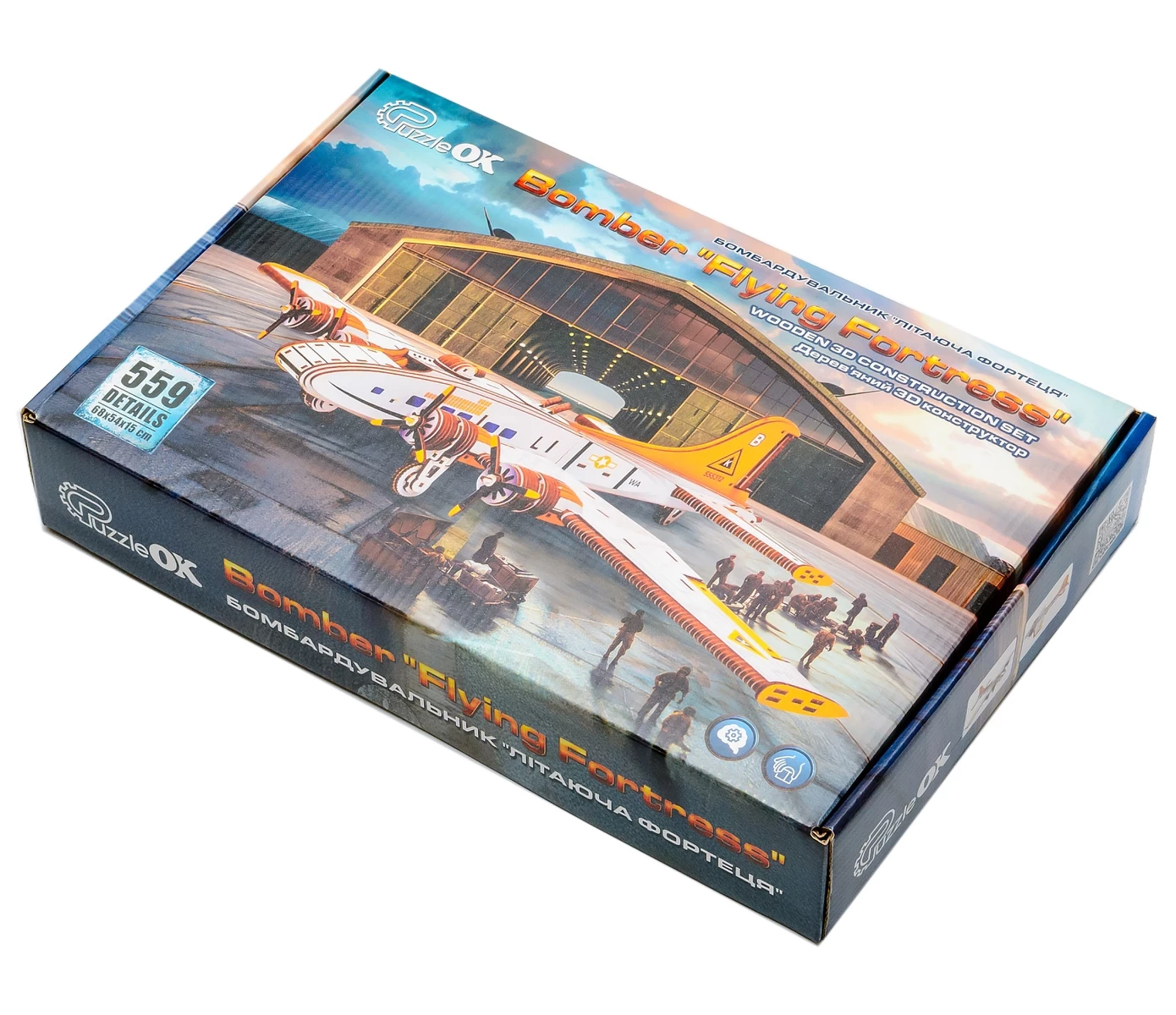 Дерев'яний 3D-конструктор від бренду PuzzleOk призначений для складання масштабної моделі бомбардувальника «Літаюча фортеця». Набір включає 559 деталей, виготовлених із натуральної деревини високої якості. Розміри моделі у зібраному вигляді становлять 68 x 54 x 15 см.