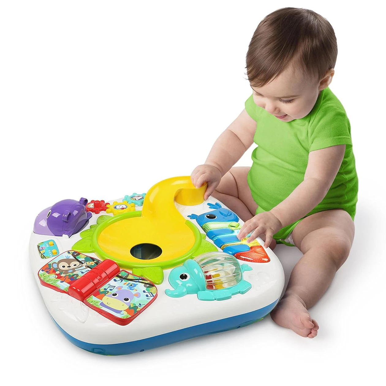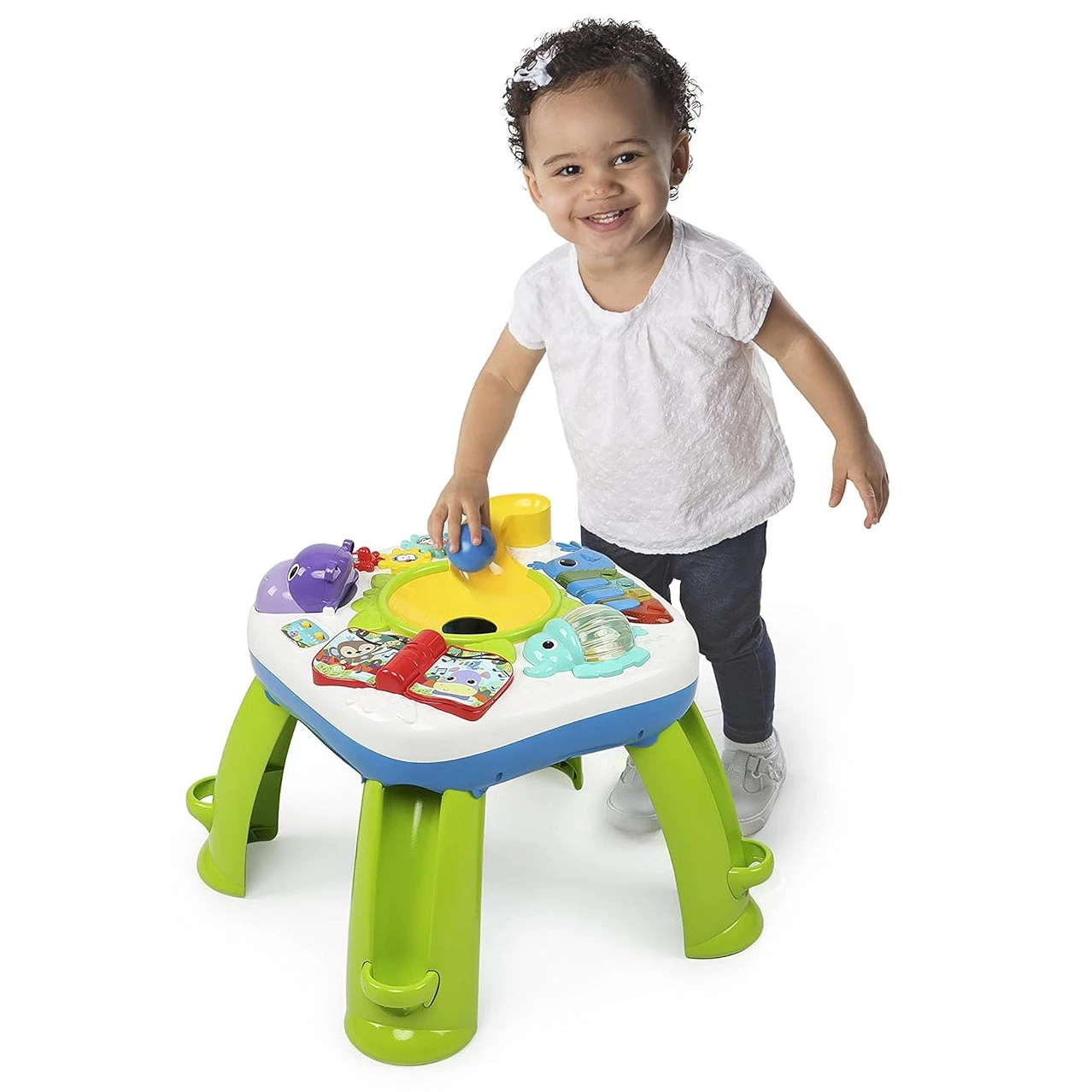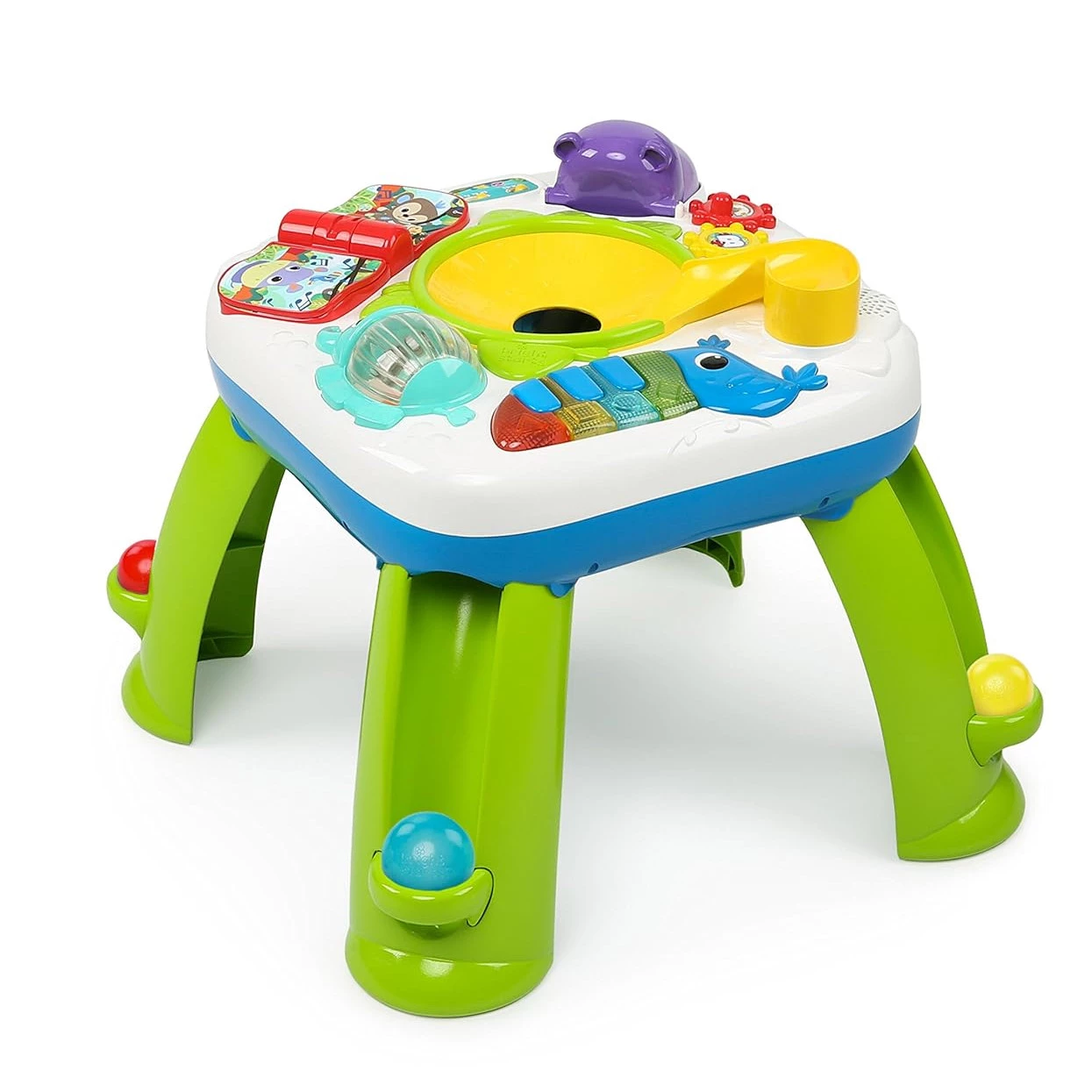 Цей дитячий ігровий стіл гарантує маленьким бешкетникам захопливе проведення часу. Стіл оснащений тунелем для спуску м'ячів, а також звуковими та світловими ефектами. Іграшка-слон обертається та відтворює забавні мелодії та звуки. Малюк почує слова чотирма мовами: англійською, французькою, іспанською та німецькою. Є барвистий тукан, дзьоб якого також є клавішами піаніно, тому малюк може створювати свою власну музику або слухати назви кольорів і форм. Рот бегемотика відкривається і закривається і видає кумедні звуки. Перегортайте сторінки книги, щоб переключатися з режиму гри на режим дослідження.