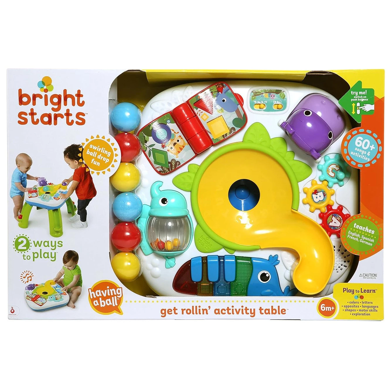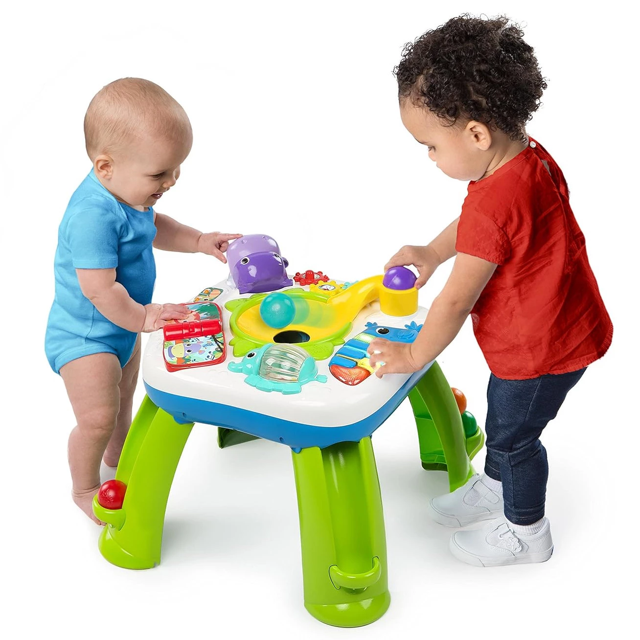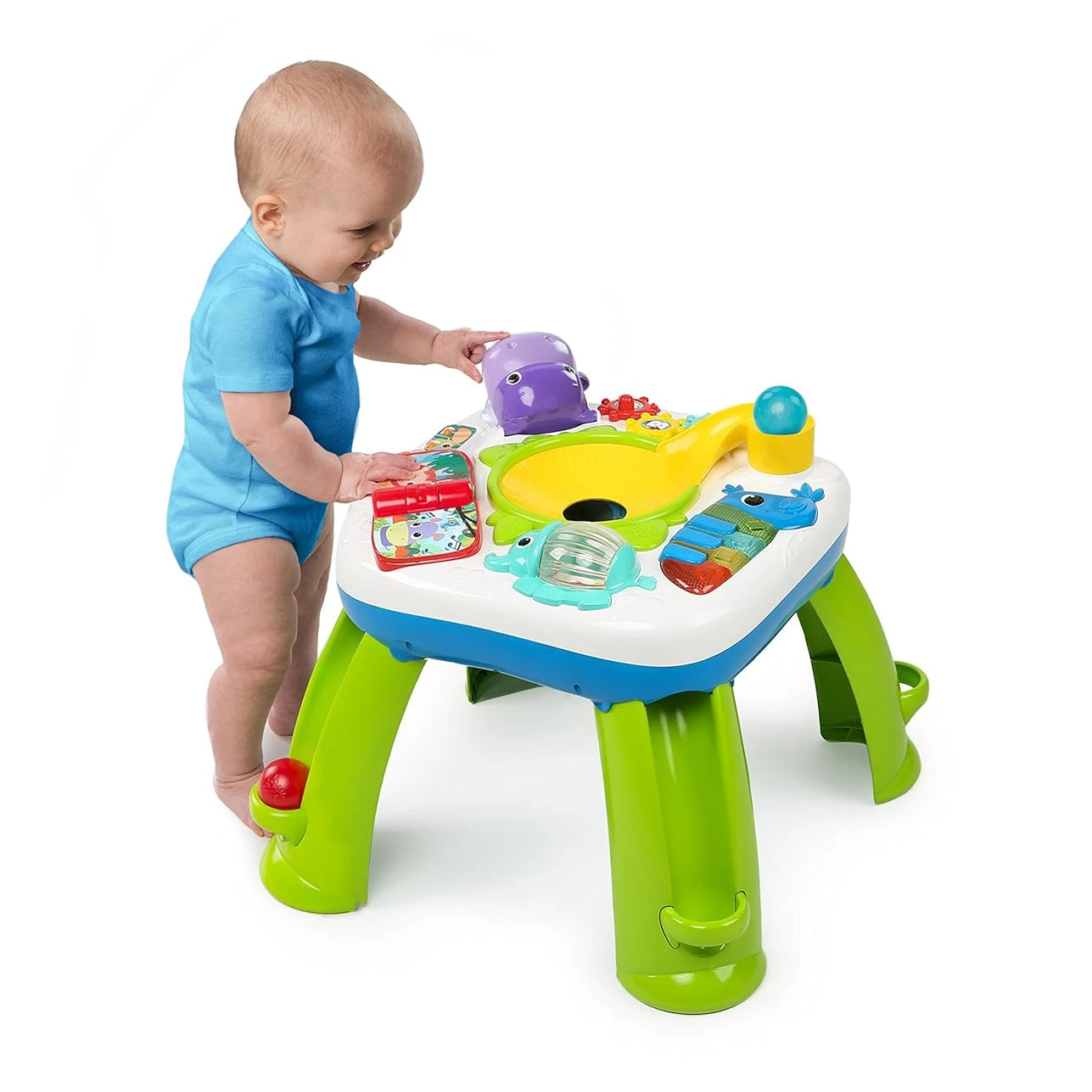 Цей дитячий ігровий стіл гарантує маленьким бешкетникам захопливе проведення часу. Стіл оснащений тунелем для спуску м'ячів, а також звуковими та світловими ефектами. Іграшка-слон обертається та відтворює забавні мелодії та звуки. Малюк почує слова чотирма мовами: англійською, французькою, іспанською та німецькою. Є барвистий тукан, дзьоб якого також є клавішами піаніно, тому малюк може створювати свою власну музику або слухати назви кольорів і форм. Рот бегемотика відкривається і закривається і видає кумедні звуки. Перегортайте сторінки книги, щоб переключатися з режиму гри на режим дослідження.