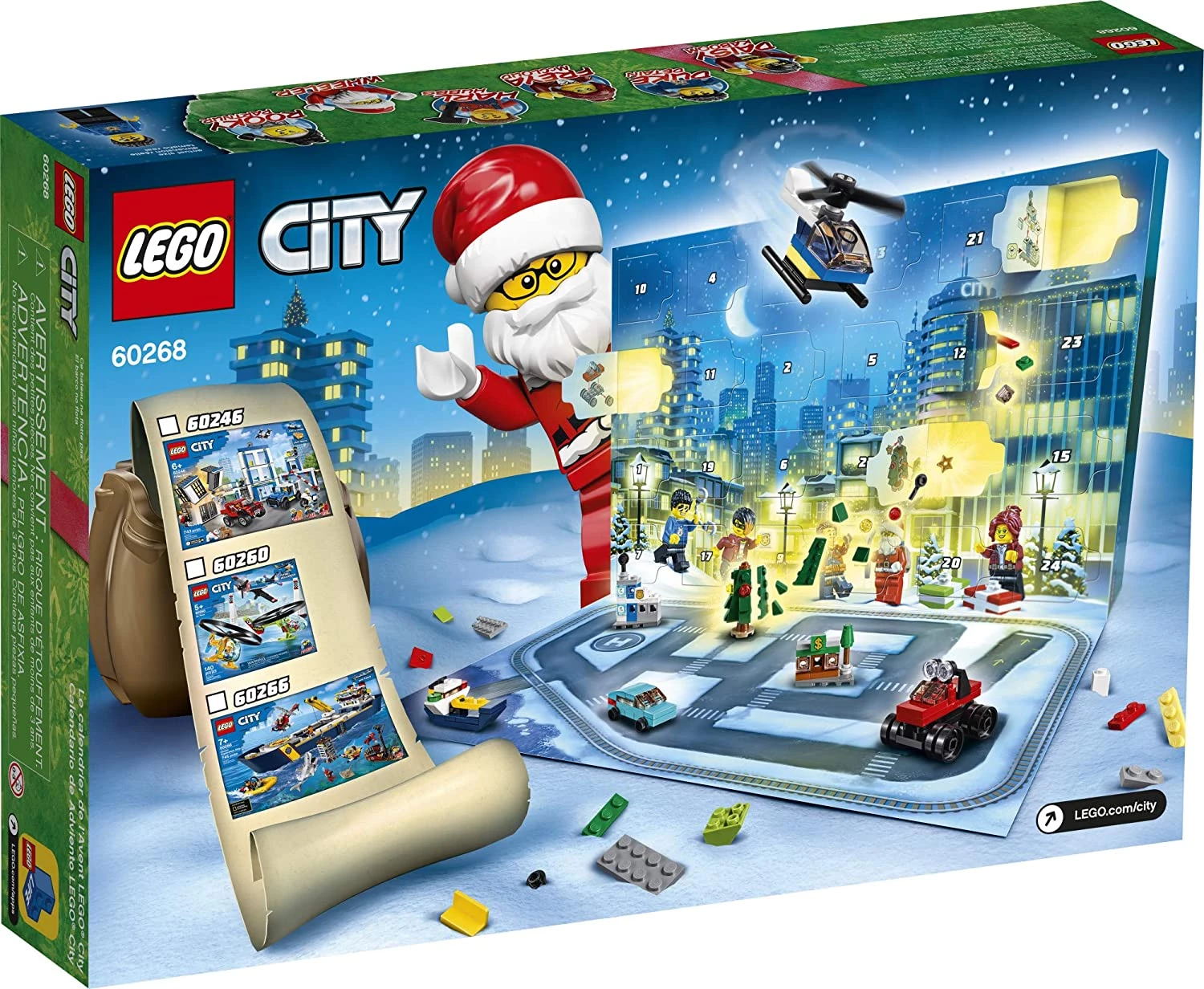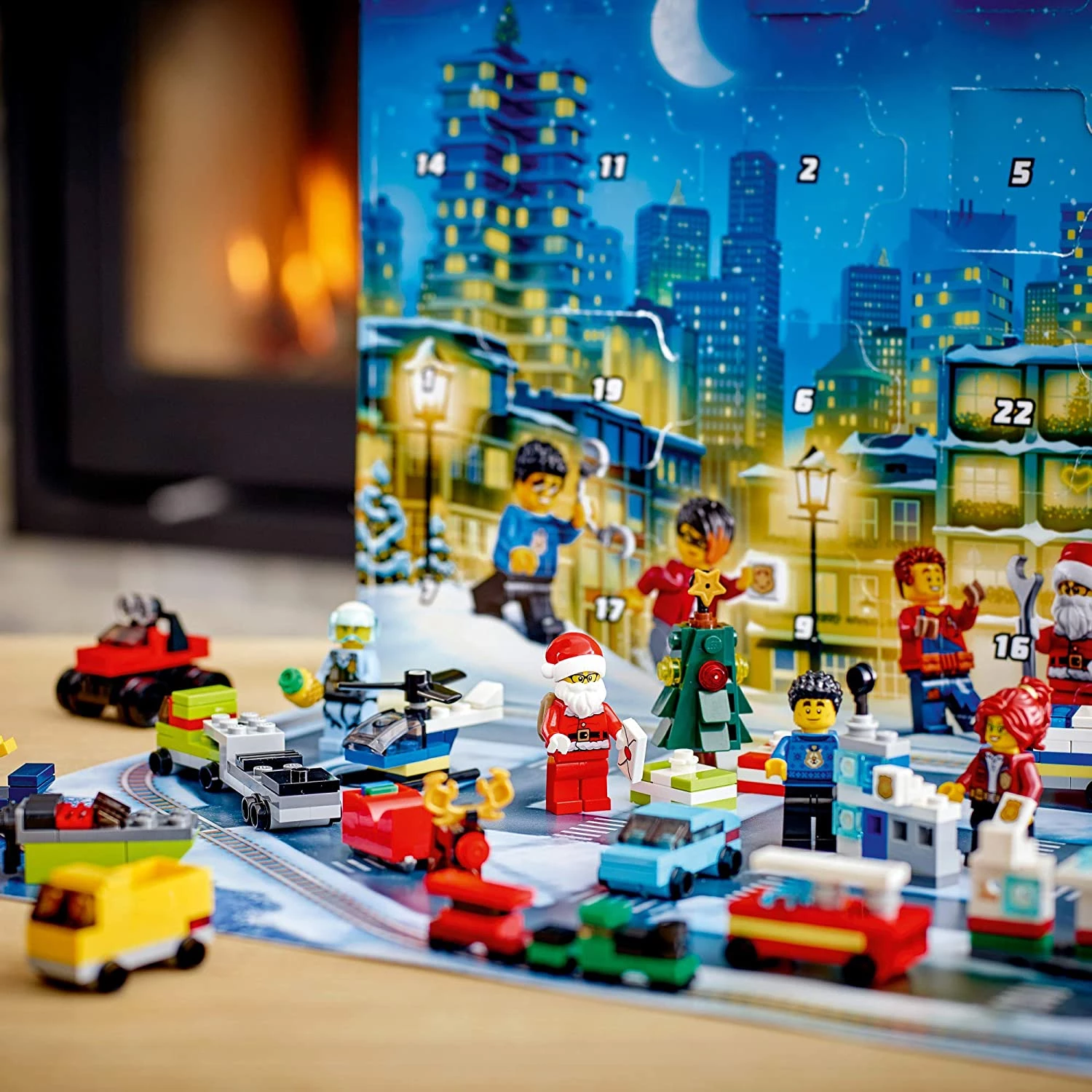 Очікування новорічних свят з цим адвент календарем Лего місто пройде весело і захоплююче. Кожен день, дитина відкриває одне віконце календаря і знаходить там фігурку. Всього в наборі 24 міні подарунка, в тому числі міні різдвяна ялинка і сани Санта-Клауса, 6 фігурок, серед яких і Санта-Клаус. Коробка адвент календаря розкладається в ігрове поле засніжене місто з дорогами, серед яких можна розставити фігурки. Коли календар буде відкритий повністю, можна створити справжнє передноворічне містечко.