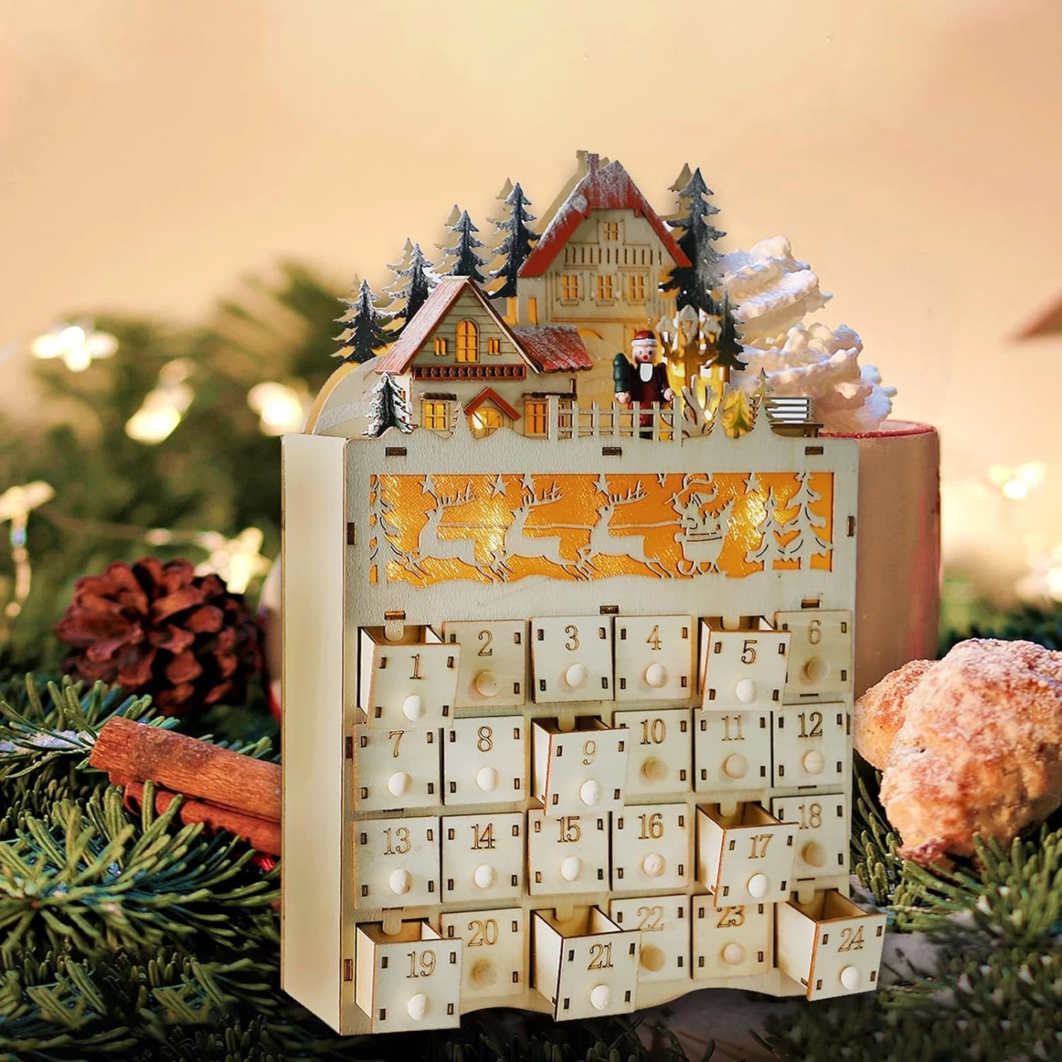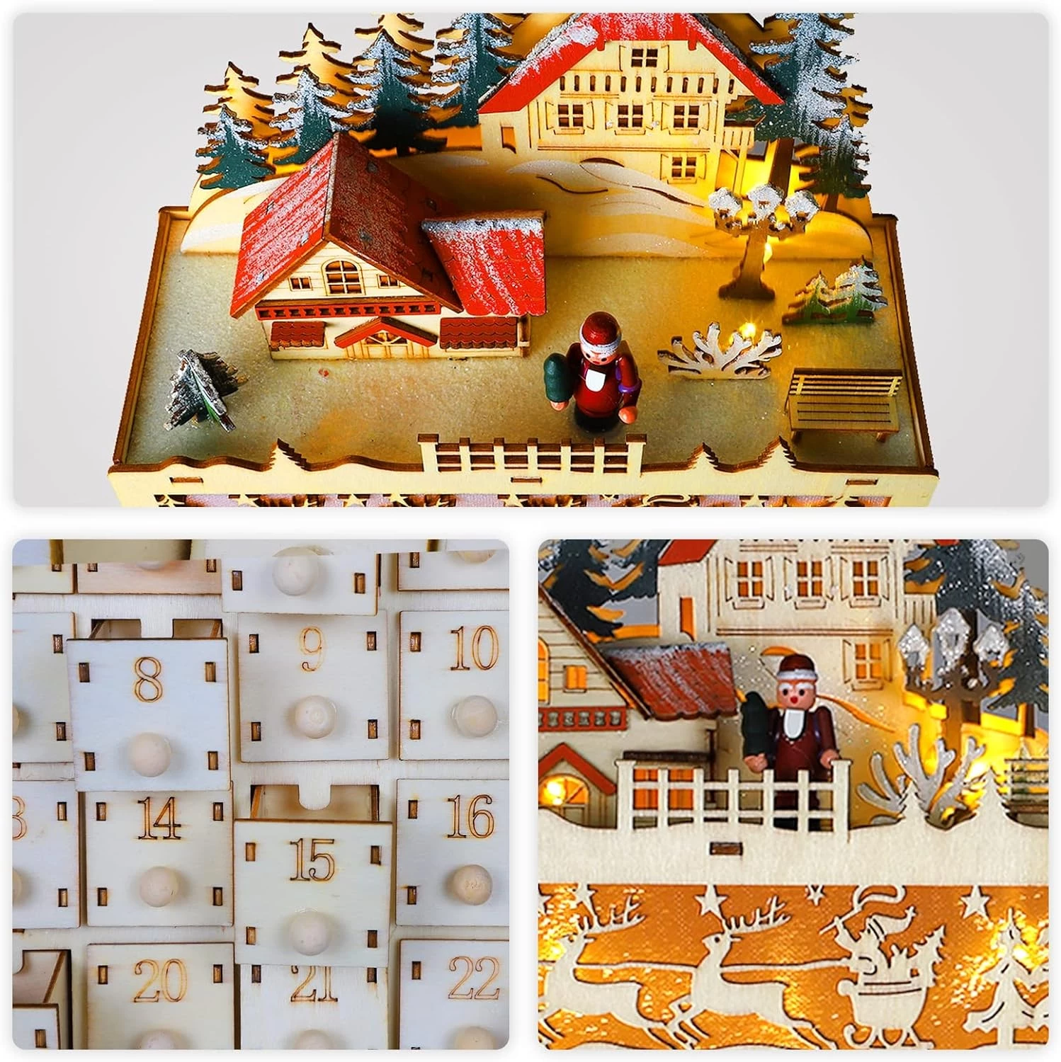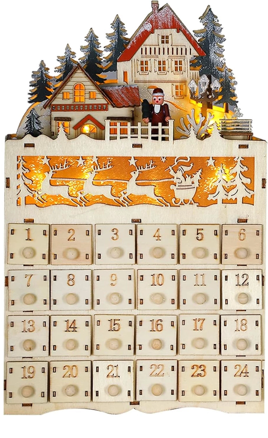 Різдвяний календар прикрашений безліччю різдвяних символів. Крім того, відтінки кольорів добре поєднуються з вашими різдвяними прикрасами. Також він прикрашений світлодіодними ліхтарями, які світяться чарівним теплим білим світлом у нічний час. (Потрібні 2 батарейки типу AA, які не входять у комплект).