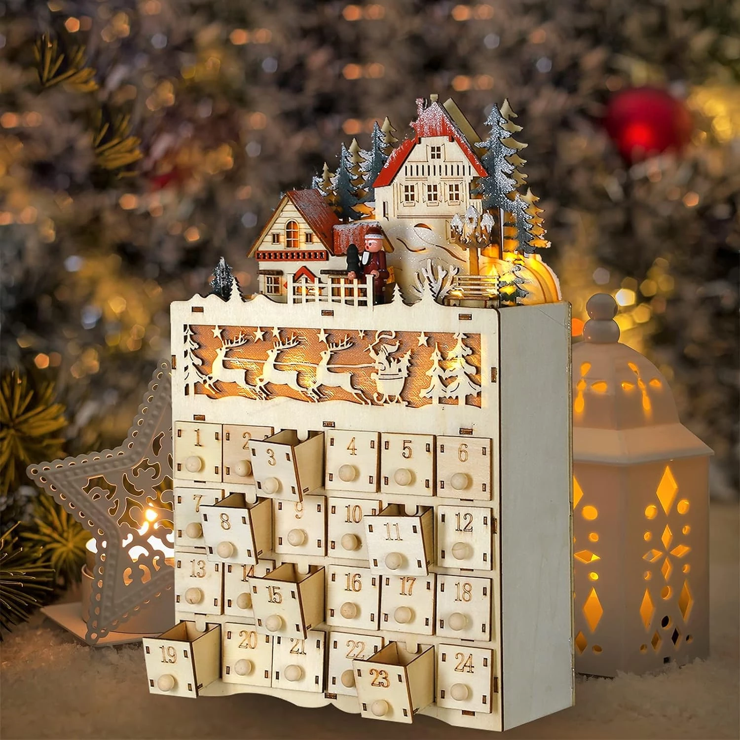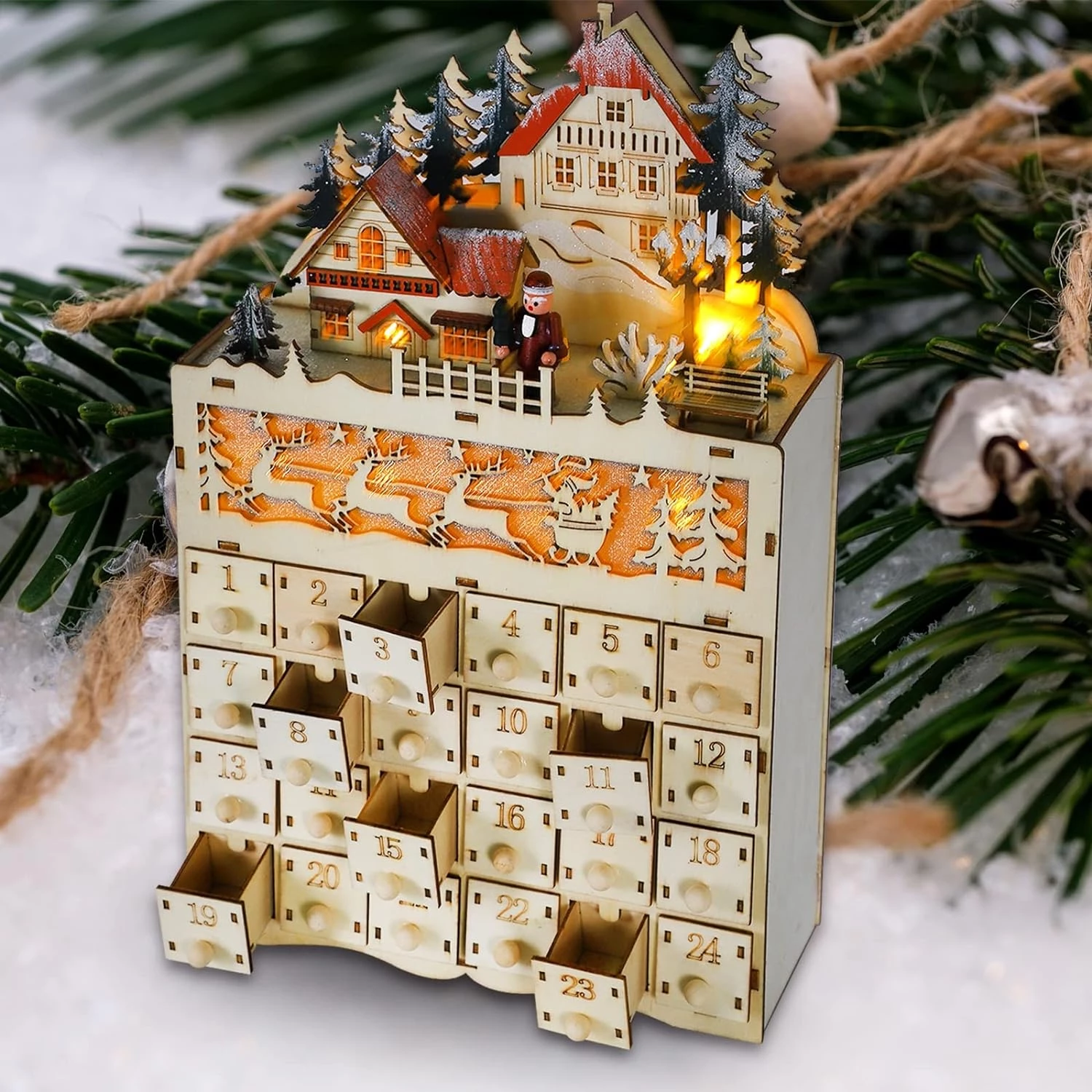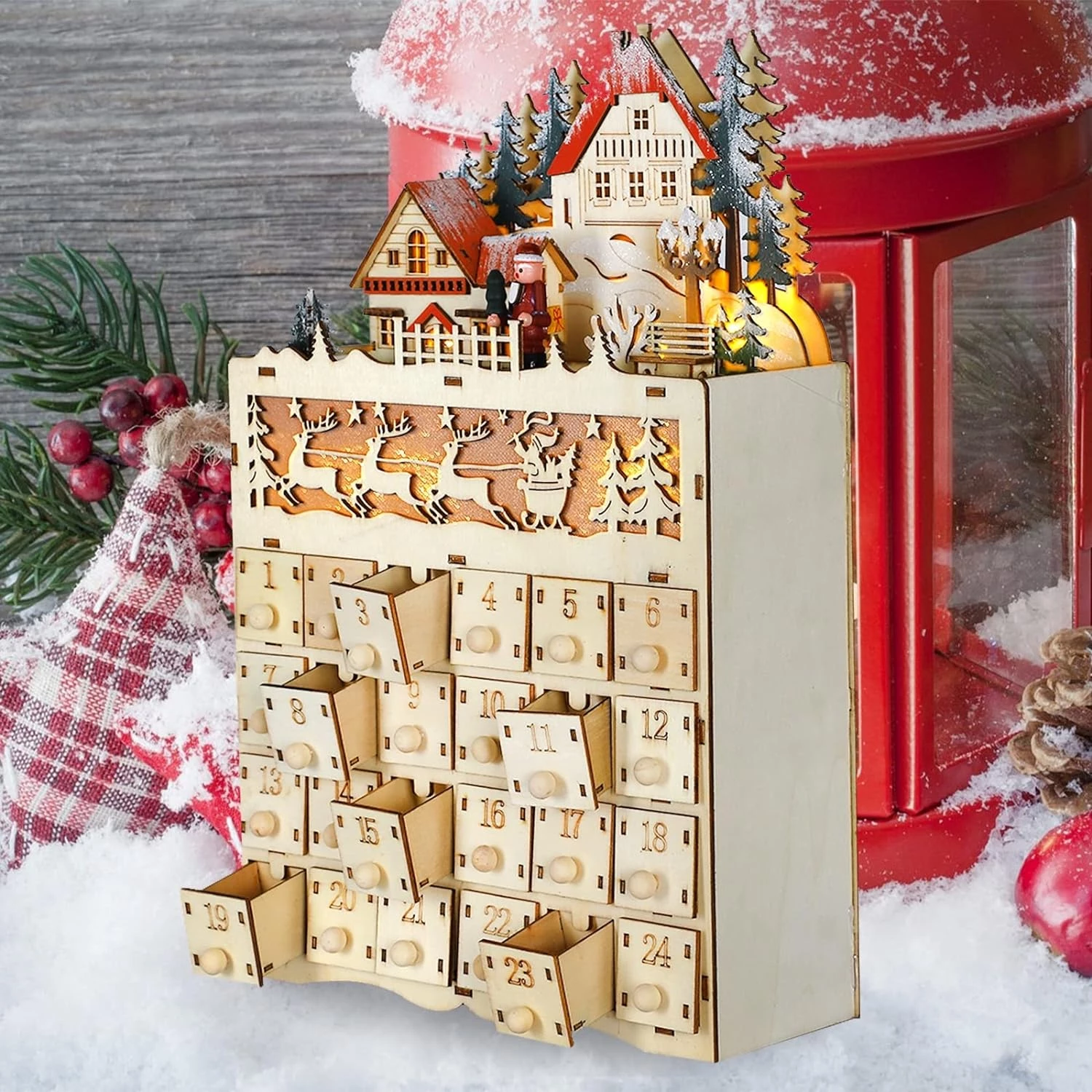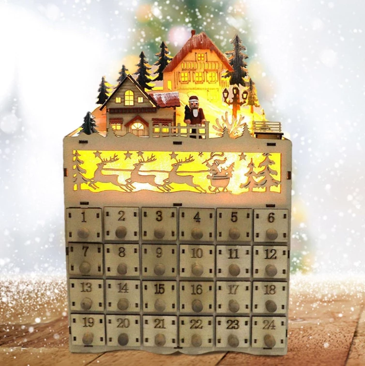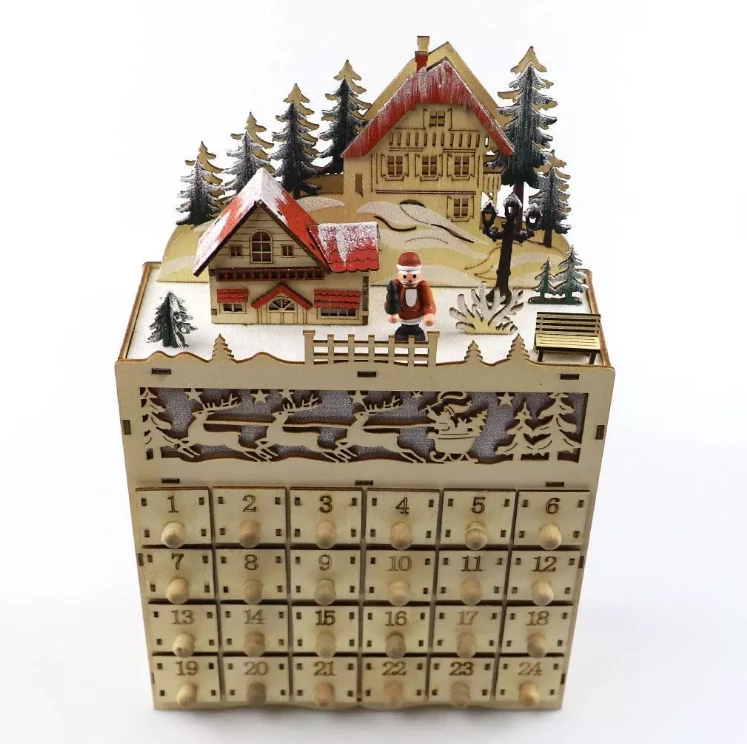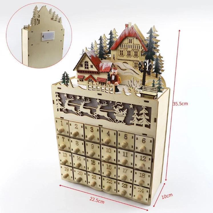 Різдвяний календар оснащений 24 пронумерованими ящиками, за якими можна сховати невеликі сюрпризи, які діти та дорослі з нетерпінням чекатимуть щодня. Наприклад, це можуть бути солодощі, дрібні монети, іграшки або спеціальні послання. Виріб має розмір 23 x 35 x 10 см. Він більший і міцніший за інші аналогічні адвенти. Завдяки високій якості матеріалів товар довговічний і може використовуватися не один рік.