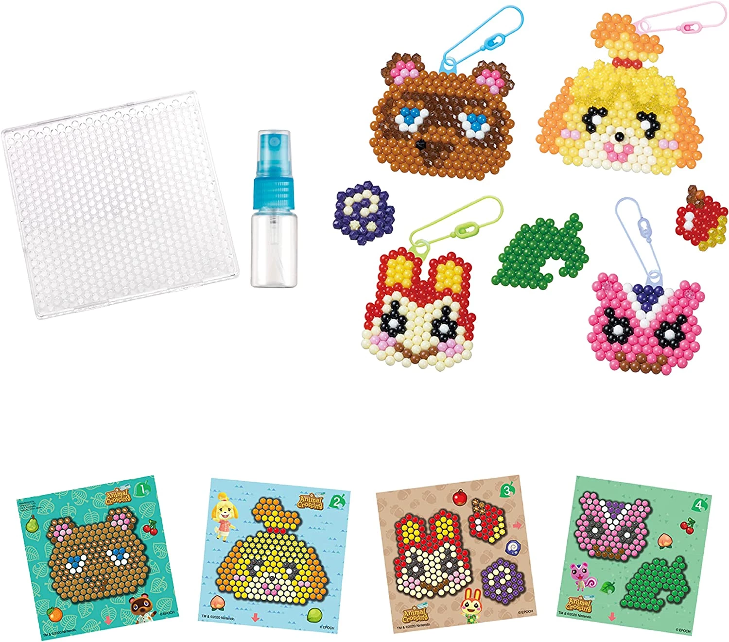 Оригінальний набір для рукоділля з аквабісеру — чудовий подарунок для дітей віком від чотирьох років! До нього входить все необхідне маленьким фантазерам для того, щоб створити фігурки своїх улюблених персонажів Animal Crossing New Horizons, включаючи єнота Тома Нука, собаку Ізабель, білку Арахіс, кролика Банні та багато інших. Представлений набір включає понад 800 однотонних намистин, дорогоцінного каміння і зірочок 22 яскравих кольорів, лоток для макетів, розпилювач, 2 двосторонні листи шаблонів, 4 кольорові пластикові брелоки та інструкції. Гачки для ключів, що входять до комплекту, дозволяють використовувати ваші улюблені вироби як брелоки.