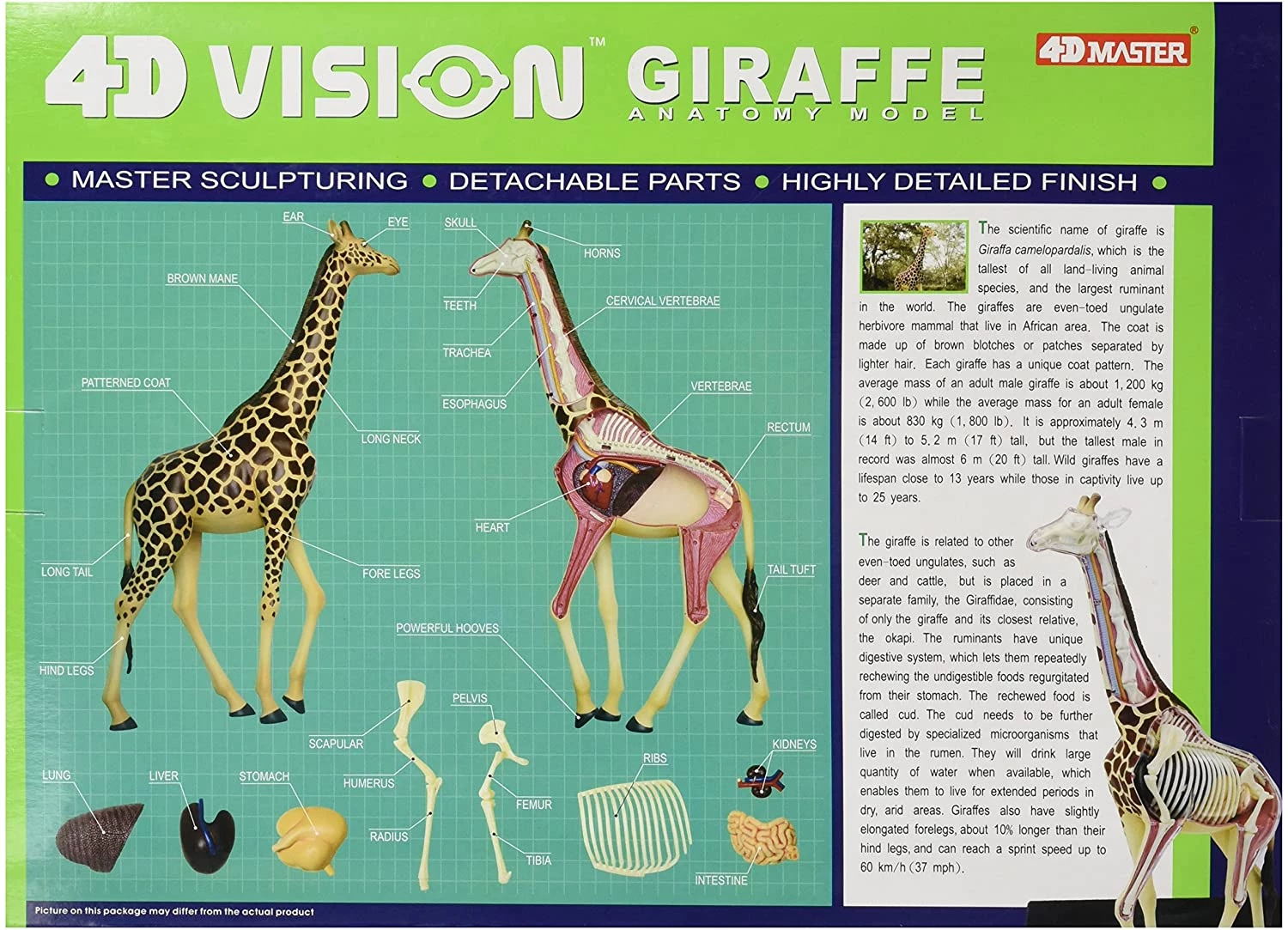 Створіть свою власну повну анатомічну модель скелета жирафа! Ця виключно докладна 37 см модель містить 27 знімних, розписаних вручну органів і частин, а також стенд. Також включає ілюстроване керівництво по збірці, опис анатомії, докладний опис життєвого циклу жирафа, звичок харчування і розмірів.