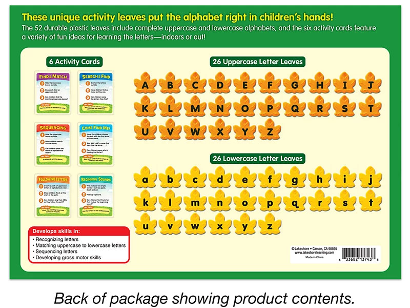Яскраві листочки з буквами допоможуть дитині вивчити англійський алфавіт швидко і весело. У наборі два види букв - великі і малі. Використовуйте картки із завданнями, щоб діти навчилися упорядковувати алфавіт, зіставляти букви і початкові звуки і багато іншого!
