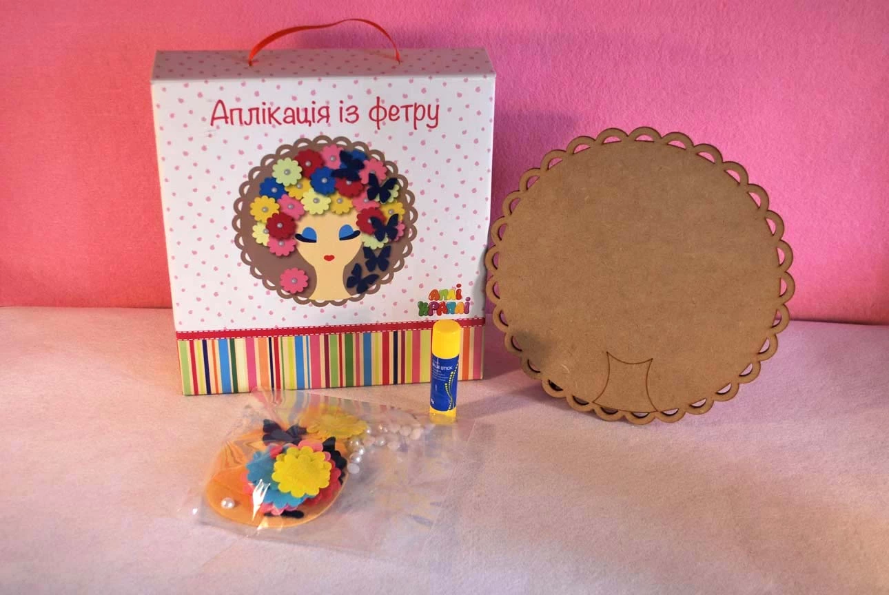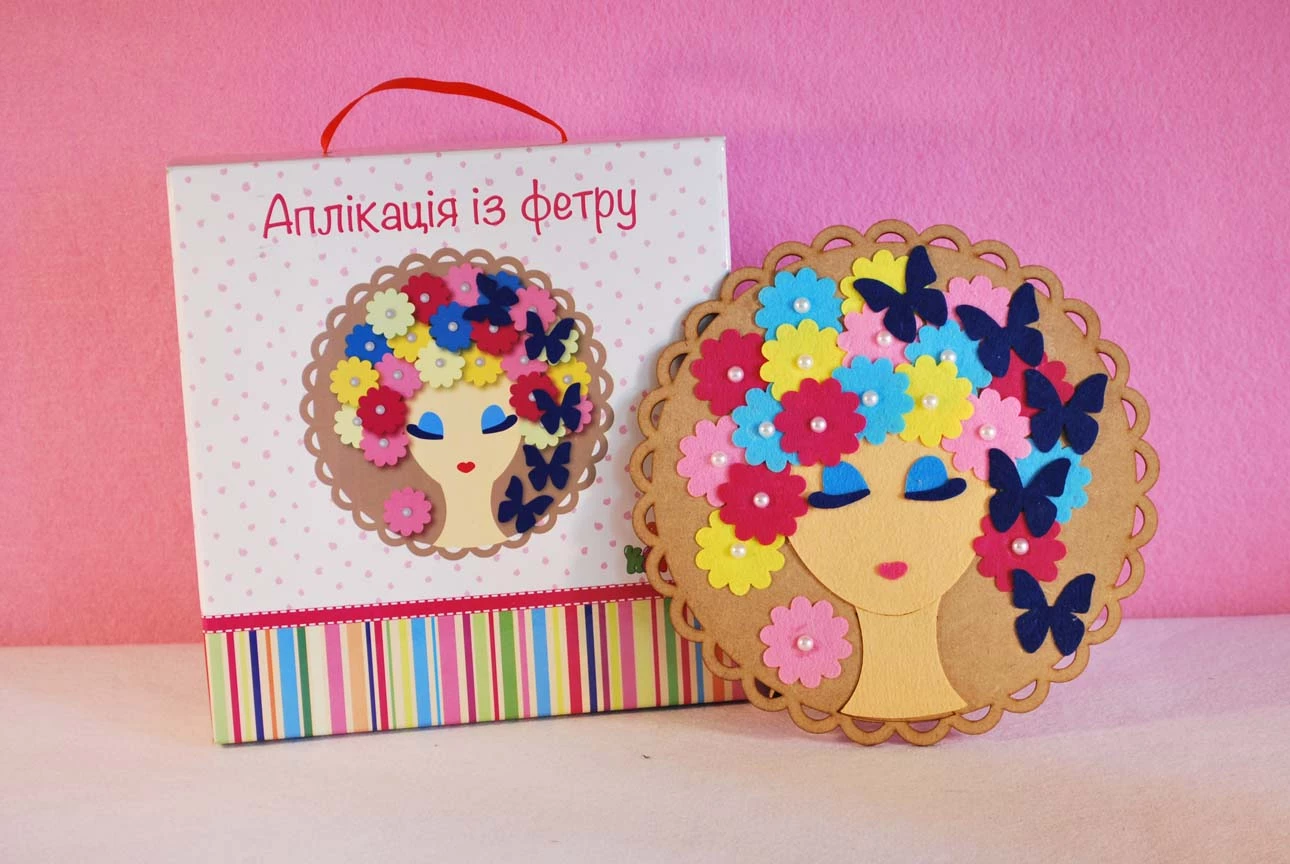 Ця чудова аплікація з зображенням дівчинки, може стати прикрасою дитячої кімнати або робочого столу дитини. Необхідно дістати всі деталі з коробки і розкласти перед собою. На круглу основу з МДФ потрібно поступово кріпити фетрові елементи. Кожна м'яка фігурка клеїться за допомогою клею, який йде в наборі. Спочатку краще приклеїти обличчя дівчини, а потім прекрасне волосся у вигляді квітів і метеликів. Можна зробити як зображено на коробці, а можна придумати свою варіацію аплікації.
