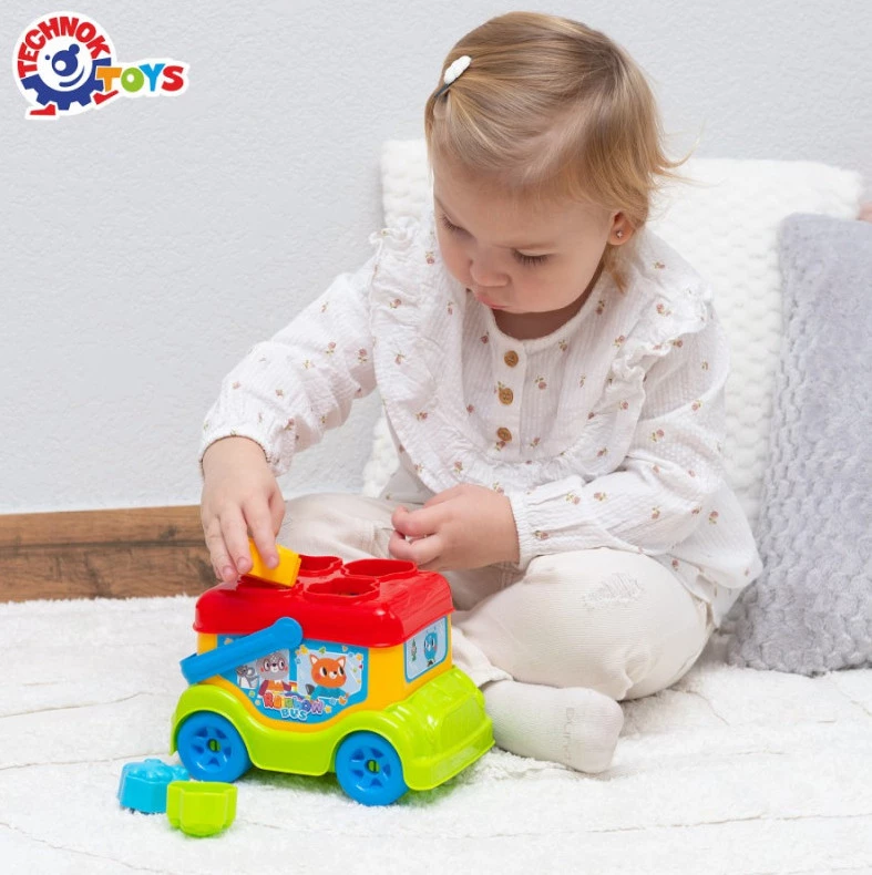 Різнокольорові фігурки допоможуть малюкам навчитися розпізнавати тварин та кольори. Отвори у даху автобуса відповідають формам фігурок.