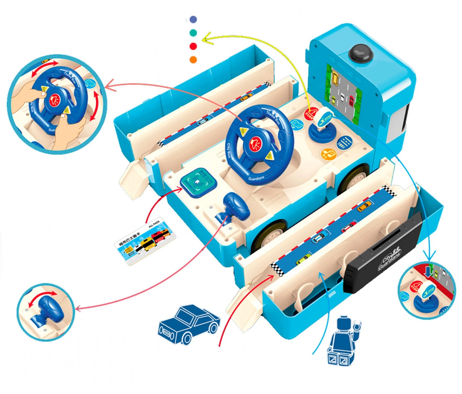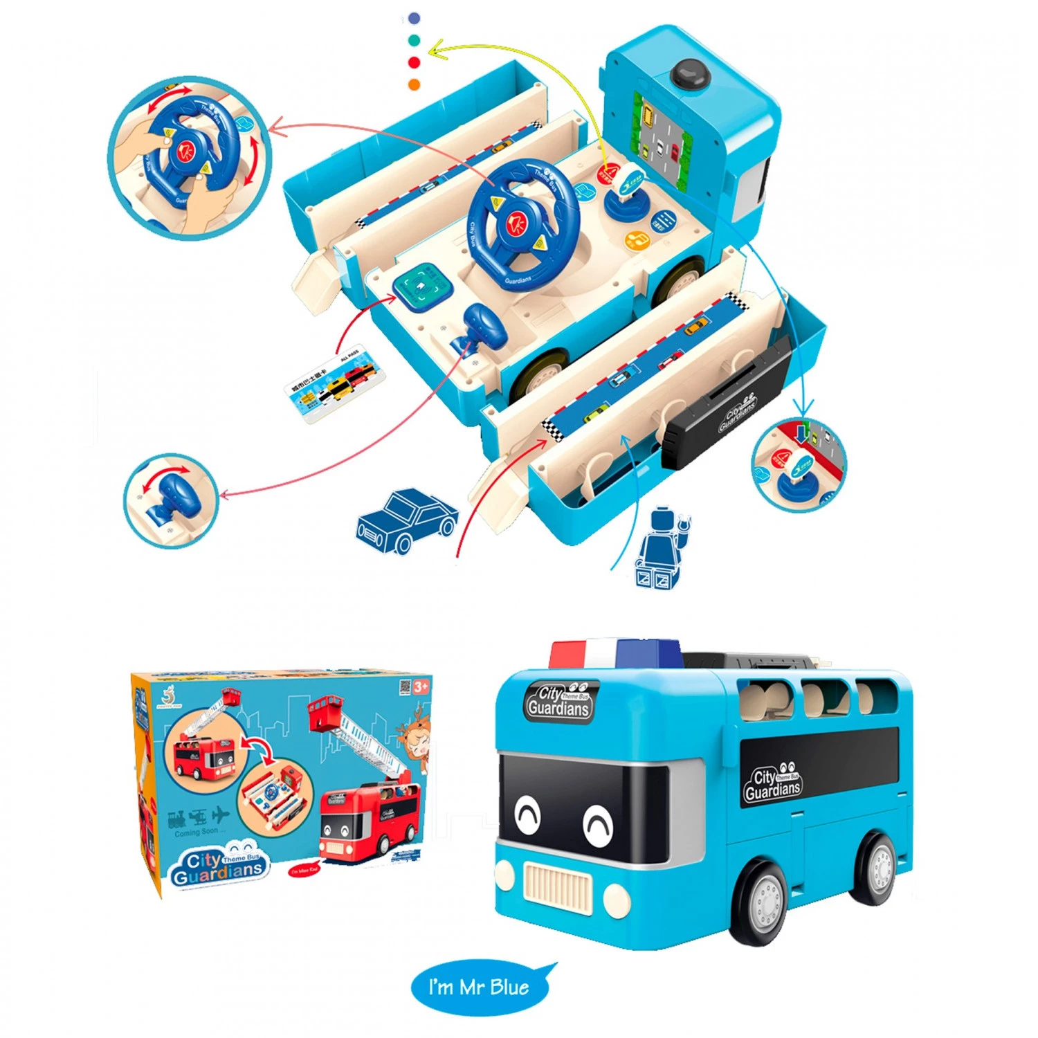 Цей багатофункціональний автобус-трансформер скрасить дитяче дозвілля та допоможе познайомитися з основами правил дорожнього руху. Іграшка виконана у вигляді поліцейського автобуса, на даху якого знаходиться маленький ключ, який заводить музичну іграшку. Головна особливість цього іграшкового транспорту — можливість перетворюватися на захопливу ігрову зону для навчання та веселощів. Усередині знаходиться повноцінна панель керування автобусом із коробкою передач, кермом, поворотниками, а також чотирма кнопками: правила руху, музика, застереження, історія.