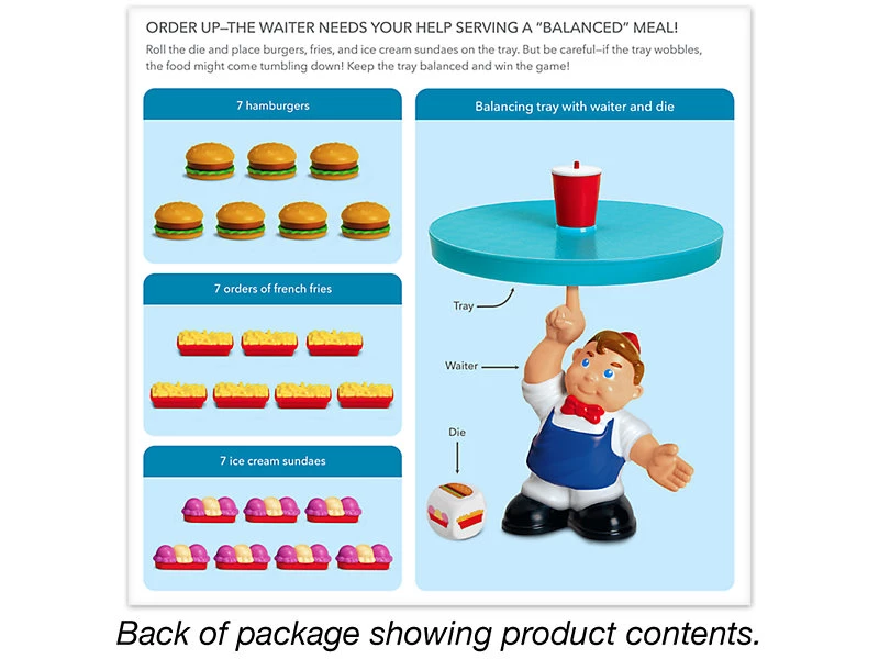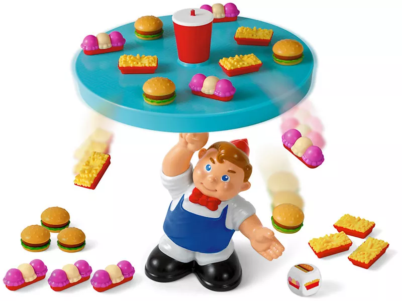 Незвичайна настільна гра, граючи в неї діти точно відчують себе маленькими офіціантами. Суть гри полягає в тому, що потрібно виконати замовлення, накладаючи їжу так, щоб балансувати на підносі. Діти просто кидають кубик і кладуть на піднос гамбургери, картоплю фрі або морозиво. Але будьте обережні - якщо піднос похитнеться, їжа може впасти! Виграє той, у кого на підносі буде більше їжі. Така гра розвиває у вашої дитини дрібну моторику, уважність і акуратність.