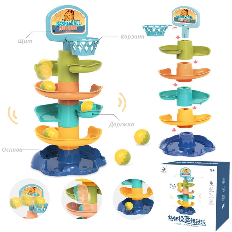 Конструкція збирається легко, тому дитина зможе зібрати вежу з баскетбольним кільцем навіть без допомоги дорослих. Усередині м'ячиків знаходяться шарудливі елементи, що привертають дитячу увагу.