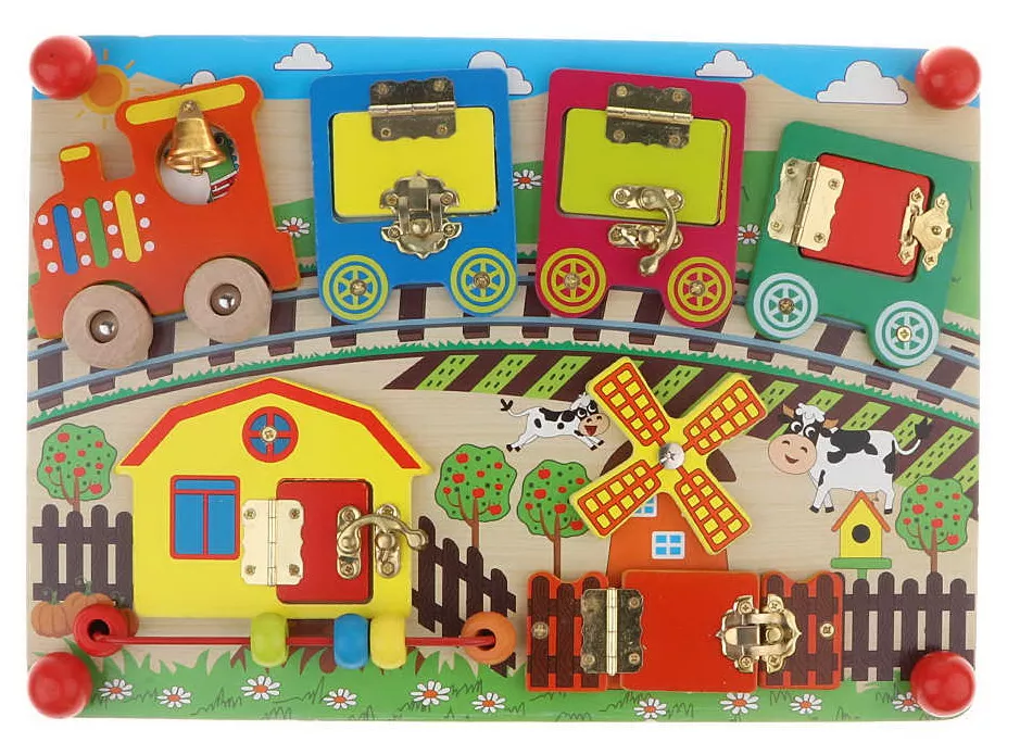 Здається, поїзд відправляється зі станції! Давайте встигнемо сісти на нього! Цей бізіборд допоможе нам вивчити його вагони і околиці трохи краще. Представлений у вигляді дерев'яного планшета з фігурками паровоза з вагонами, будиночка і млина, він ще й оснащений рухомими елементами, дзвіночком, замочками і навіть пальчиковим лабіринтом!