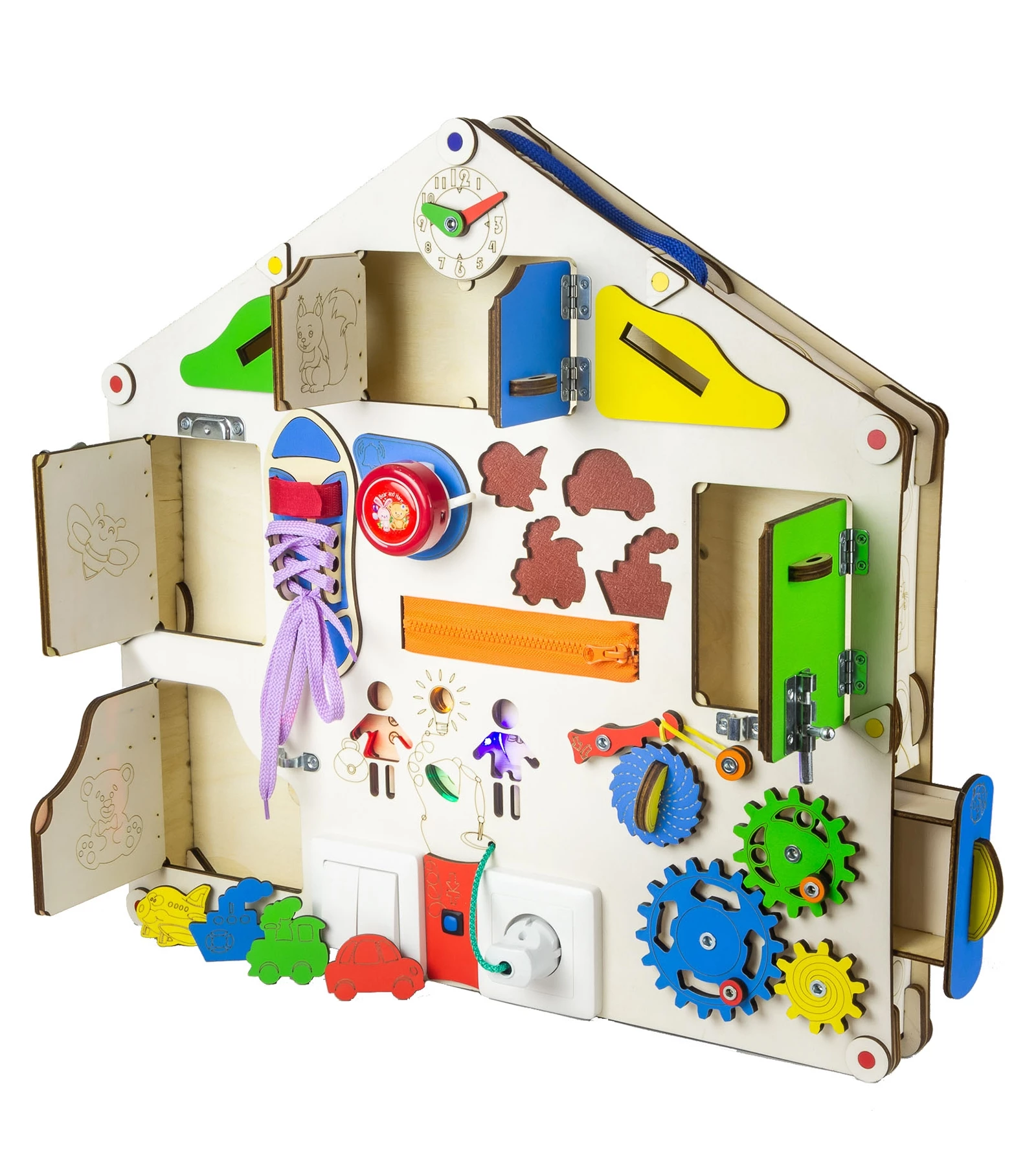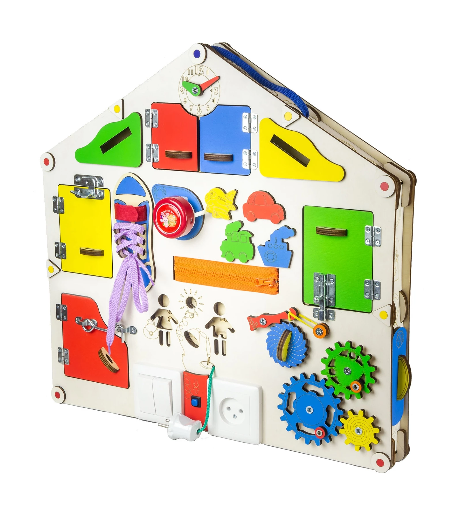 Дошка допоможе дитині вивчити букви, цифри, кольори і розстібання і застібання блискавки. На бізідошці п'ять дверей з різними замочками, за ними можна розміщувати картки для вивчення. Є годинник, який допоможе дитині вивчити цифри і час.
